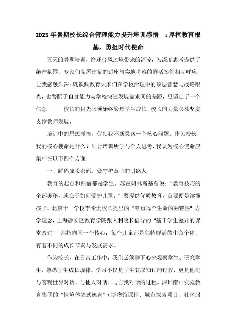 2025年暑期校长综合管理能力提升培训感悟:厚植教育根基,勇担时代使命五天的暑期培训,恰逢台风过境带来的清凉,为深度思考提供了绝佳氛围。专家们高屋建瓴的讲座与实地考察的鲜活案例相互呼应,让我感触颇深:既钦佩教育大家们在学校治理中的顶层智慧与战略眼光,也警醒于自身能力与学校快速发展需求间的差距,更坚定了一个信念一一校长的目光必须始终聚焦学生成长,校长的力量必须坚实支撑教师发展。培训中的思想碰撞,促使我不断思索一个核心问题:作为校长,我的核心使命是什么?结合培训所学与个人思考,我认为核心使命应集中在以下四个方面:一、解码成长密码,做守护童心的引路人教育的起点和归宿都是学生。苏霍姆林斯基曾说:"教育技巧的全部奥秘,就在于如何爱护儿童。"要提供优质教育,首要便是读懂孩子。北京十一学校李希贵校长提出的"尊重每个生命的独特性"办学理念,上海静安区教育学院张人利院长倡导的"基于学生差异的课堂改进",都指向同一个核心:每个儿童都是独特鲜活的生命个体,有着不同的成长节奏与发展需求。作为校长,在日常工作中,我们必须静下心来观察学生、研究学生,熟悉学生成长规律。学习不仅是学生获取知识的过程,更是他们与客观世界对话、与他人对话、与自我对话的过程。深圳南山实验教育集团的"情境体验式德育"(博物馆课程、城市探索项目、社区服