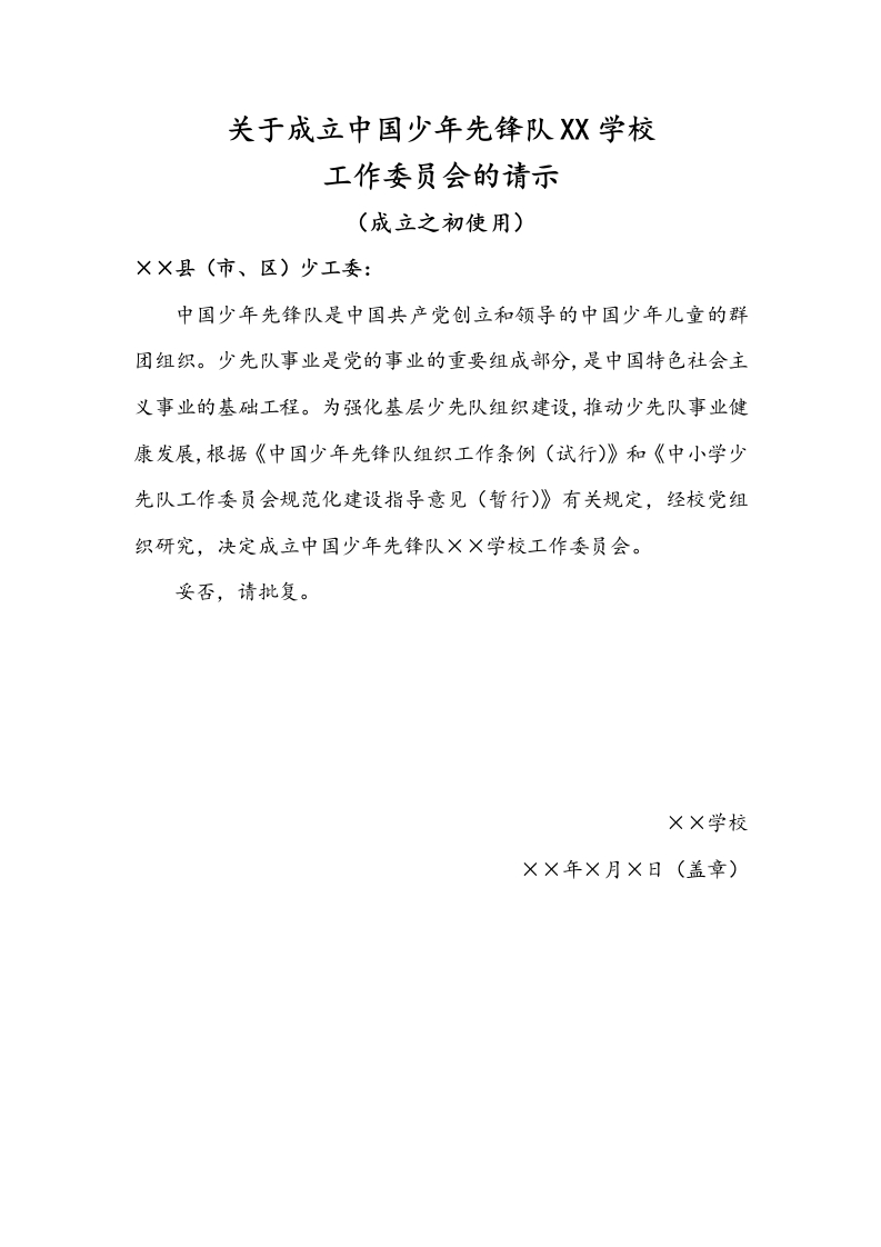 关于成立中国少年先锋队X学校工作委员会的请示(成立之初使用)中国少年先锋队是中国共产党创立和领导的中国少年儿童的群团组织。少先队事业是党的事业的重要组成部分,是中国特色社会主义事业的基础工程。为强化基层少先队组织建设,推动少先队事业健康发展,根据《中国少年先锋队组织工作条例(试行)》和《中小学少先队工作委员会规范化建设指导意见(暂行)》有关规定,经校党组织研究,决定成立中国少年先锋队X×学校工作委员会。妥否,请批复。