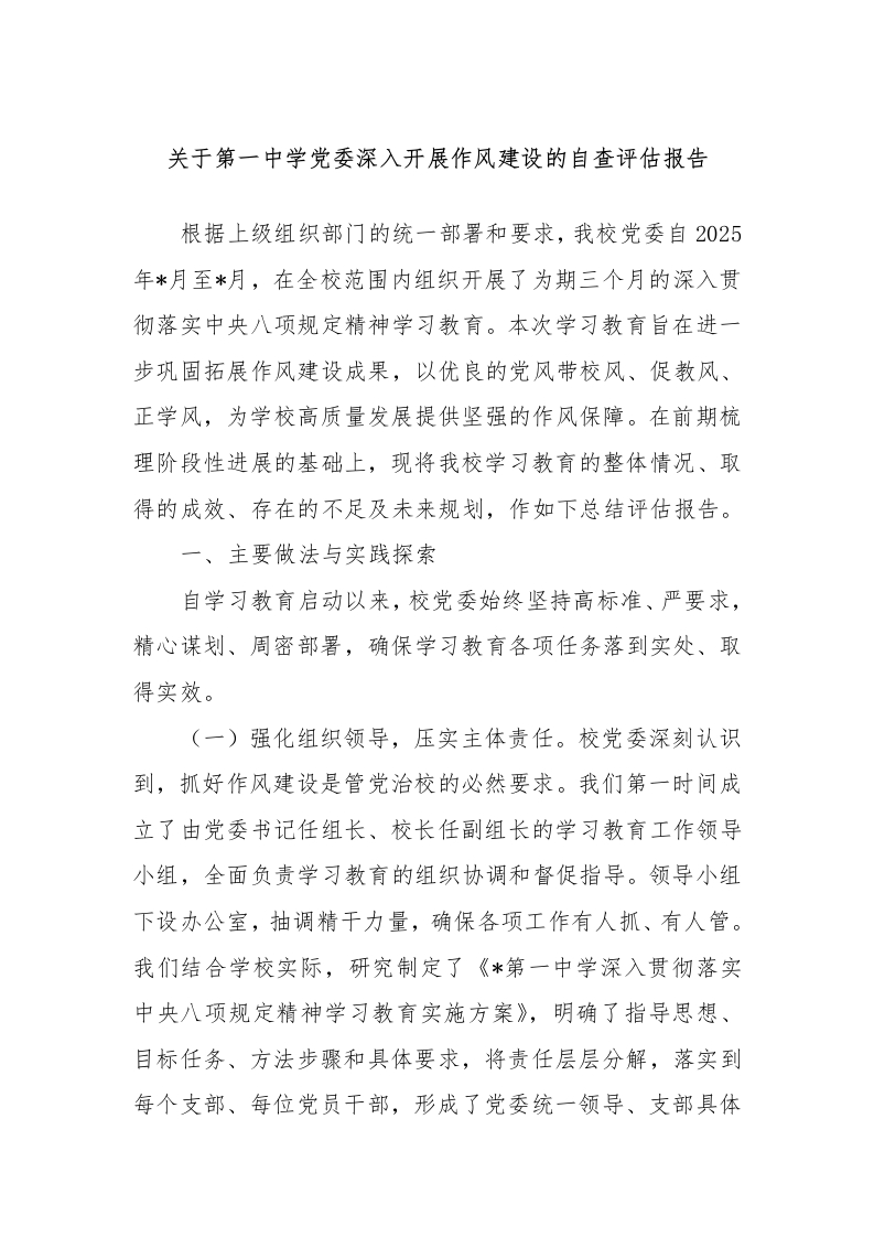 关于第一中学党委深入开展作风建设的自查评估报告根据上级组织部门的统一部署和要求,我校党委自2025年*月至*月,在全校范围内组织开展了为期三个月的深入贯彻落实中央八项规定精神学习教育。本次学习教育旨在进一步巩固拓展作风建设成果,以优良的党风带校风、促教风、正学风,为学校高质量发展提供坚强的作风保障。在前期梳理阶段性进展的基础上,现将我校学习教育的整体情况、取得的成效、存在的不足及未来规划,作如下总结评估报告。一、主要做法与实践探索自学习教育启动以来,校党委始终坚持高标准、严要求,精心谋划、周密部署,确保学习教育各项任务落到实处、取得实效。(一)强化组织领导,压实主体责任。校党委深刻认识到,抓好作风建设是管党治校的必然要求。我们第一时间成立了由党委书记任组长、校长任副组长的学习教育工作领导小组,全面负责学习教育的组织协调和督促指导。领导小组下设办公室,抽调精干力量,确保各项工作有人抓、有人管。我们结合学校实际,研究制定了《*第一中学深入贯彻落实中央八项规定精神学习教育实施方案》,明确了指导思想、目标任务、方法步骤和具体要求,将责任层层分解,落实到每个支部、每位党员干部,形成了党委统一领导、支部具体
