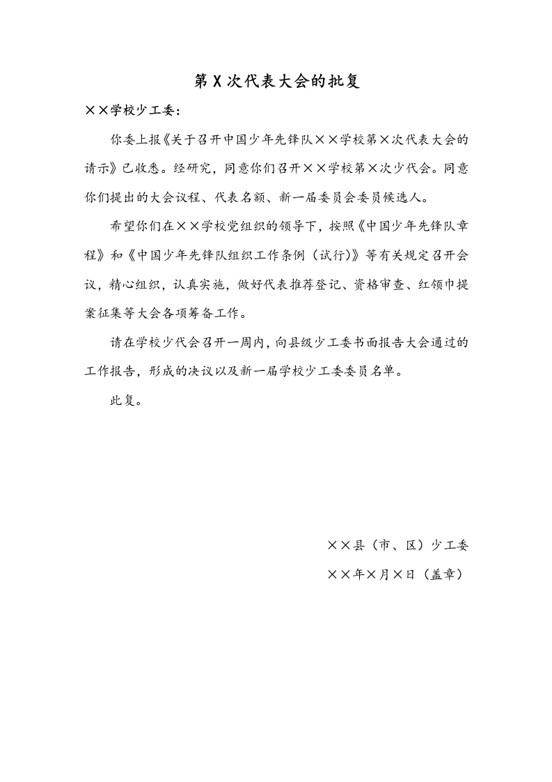第X次代表大会的批复X×学校少工委:你委上报《关于召开中国少年先锋队××学校第×次代表大会的请示》已收悉。经研究,同意你们召开××学校第×次少代会。同意你们提出的大会议程、代表名额、新一届委员会委员候选人。希望你们在××学校党组织的领导下,按照《中国少年先锋队章程》和《中国少年先锋队组织工作条例(试行)》等有关规定召开会议,精心组织,认真实施,做好代表推荐登记、资格审查、红领巾提案征集等大会各项筹备工作。请在学校少代会召开一周内,向县级少工委书面报告大会通过的工作报告,形成的决议以及新一届学校少工委委员名单。此复。××县(市、区)少工委