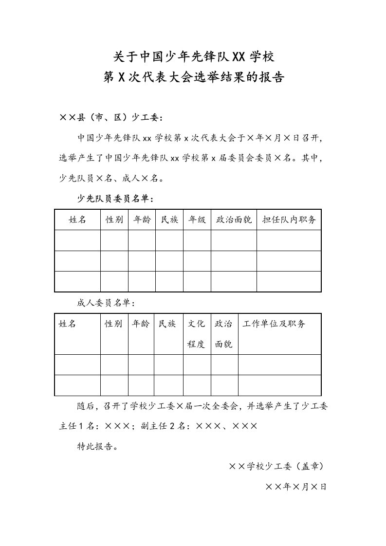 关于中国少年先锋队X学校第X次代表大会选举结果的报告XX县(市、区)少工委:中国少年先锋队xx学校第x次代表大会于×年×月×日召开,选举产生了中国少年先锋队xx学校第x届委员会委员×名。其中,少先队员×名、成人×名。少先队员委员名单:姓名性别年龄民族年级政治面貌担任队内职务成人委员名单:姓名性别年龄民族文化政治工作单位及职务程度面貌随后,召开了学校少工委X届一次全委会,并选举产生了少工委特此报告。