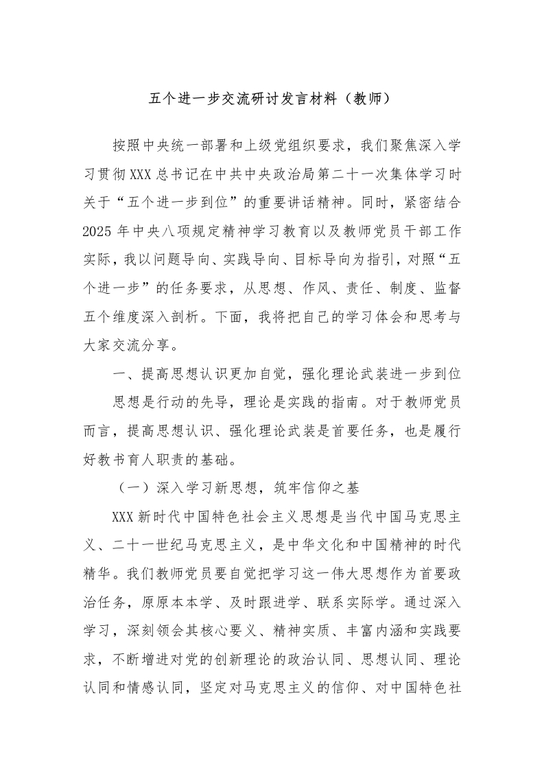 五个进一步交流研讨发言材料(教师)按照中央统一部署和上级党组织要求,我们聚焦深入学习贯彻XXX总书记在中共中央政治局第二十一次集体学习时关于“五个进一步到位”的重要讲话精神。同时,紧密结合2025年中央八项规定精神学习教育以及教师党员干部工作实际,我以问题导向、实践导向、目标导向为指引,对照“五个进一步”的任务要求,从思想、作风、责任、制度、监督五个维度深入剖析。下面,我将把自己的学习体会和思考与大家交流分享。一、提高思想认识更加自觉,强化理论武装进一步到位思想是行动的先导,理论是实践的指南。对于教师党员而言,提高思想认识、强化理论武装是首要任务,也是履行好教书育人职责的基础。(一)深入学习新思想,筑牢信仰之基XXX新时代中国特色社会主义思想是当代中国马克思主义、二十一世纪马克思主义,是中华文化和中国精神的时代精华。我们教师党员要自觉把学习这一伟大思想作为首要政治任务,原原本本学、及时跟进学、联系实际学。通过深入学习,深刻领会其核心要义、精神实质、丰富内涵和实践要求,不断增进对党的创新理论的政治认同、思想认同、理论认同和情感认同,坚定对马克思主义的信仰、对中国特色社