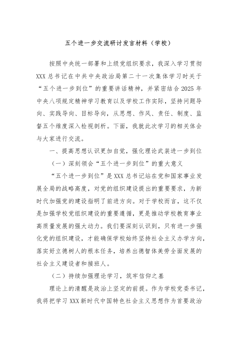 五个进一步交流研讨发言材料(学校)按照中央统一部署和上级党组织要求,我深入学习贯彻XXX总书记在中共中央政治局第二十一次集体学习时关于“五个进一步到位”的重要讲话精神,并紧密结合2025年中央八项规定精神学习教育以及学校工作实际,坚持问题导向、实践导向、目标导向,从思想、作风、责任、制度、监督五个维度深入检视剖析。下面,我就此次学习的相关体会与大家进行交流。一、提高思想认识更加自觉,强化理论武装进一步到位(一)深刻领会“五个进一步到位”的重大意义“五个进一步到位”是XXX总书记站在党和国家事业发展全局的战略高度,对党的组织建设提出的重要要求,为新时代加强党的建设指明了前进方向。对于学校而言,这不仅是加强学校党组织建设的重要遵循,更是推动学校教育事业高质量发展的强大动力。我们要深刻认识到,只有进一步强化党的组织建设,才能确保学校始终坚持社会主义办学方向,落实好立德树人的根本任务,培养出德智体美劳全面发展的社会主义建设者和接班人。(二)持续加强理论学习,筑牢信仰之基理论上的清醒是政治上坚定的前提。作为学校党委书记,我将把学习XXX新时代中国特色社会主义思想作为首要政治