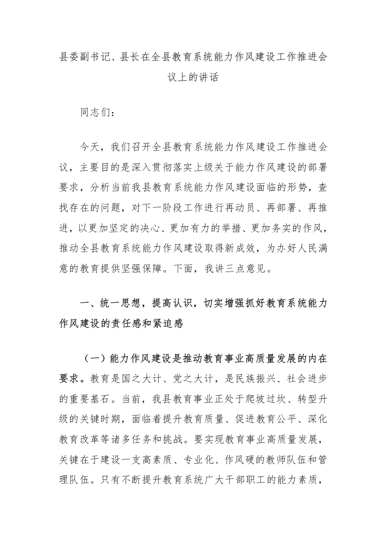 县委副书记、县长在全县教育系统能力作风建设工作推进会议上的讲话同志们:今天,我们召开全县教育系统能力作风建设工作推进会议,主要目的是深入贯彻落实上级关于能力作风建设的部署要求,分析当前我县教育系统能力作风建设面临的形势,查找存在的问题,对下一阶段工作进行再动员、再部署、再推进,以更加坚定的决心、更加有力的举措、更加务实的作风,推动全县教育系统能力作风建设取得新成效,为办好人民满意的教育提供坚强保障。下面,我讲三点意见。一、统一思想,提高认识,切实增强抓好教育系统能力作风建设的责任感和紧迫感(一)能力作风建设是推动教育事业高质量发展的内在要求。教育是国之大计、党之大计,是民族振兴、社会进步的重要基石。当前,我县教育事业正处于爬坡过坎、转型升级的关键时期,面临着提升教育质量、促进教育公平、深化教育改革等诸多任务和挑战。要实现教育事业高质量发展,关键在于建设一支高素质、专业化、作风硬的教师队伍和管理队伍。只有不断提升教育系统广大干部职工的能力素质,