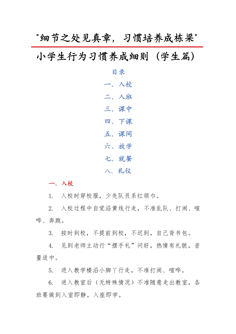 "细节之处见真章,习惯培养成栋梁"小学生行为习惯养成细则(学生篇)目录一、入校二、入班三、课中四、下课五、课间六、放学七、就餐八、礼仪一、入校1.入校时穿校服,少先队员系红领巾。2.入校过程中自觉沿黄线行走,不准乱队、打闹、喧哗、奔跑。3.按时到校,不提前到校,不迟到,自己背书包。4.见到老师主动行“摆手礼”问好,热情有礼貌,音量适中。5.进入教学楼沿小脚丫行走,不准打闹、喧哗。6.进入教室后(无特殊情况)不准随意走出教室,各班要做到入室即静,入座即学。