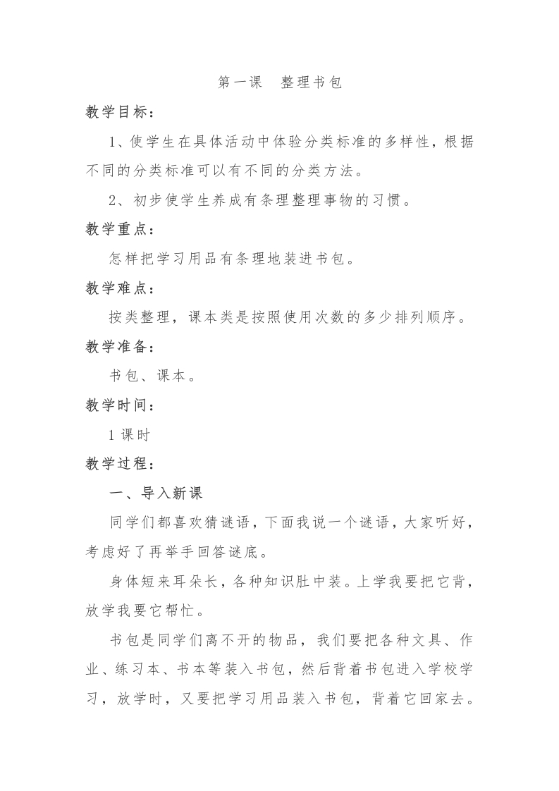 第一课整理书包教学目标:1、使学生在具体活动中体验分类标准的多样性,根据不同的分类标准可以有不同的分类方法。2、初步使学生养成有条理整理事物的习惯。教学重点:怎样把学习用品有条理地装进书包。教学难点:按类整理,课本类是按照使用次数的多少排列顺序。教学准备:书包、课本。教学时间:1课时教学过程:一、导入新课同学们都喜欢猜谜语,下面我说一个谜语,大家听好,考虑好了再举手回答谜底。身体短来耳朵长,各种知识肚中装。上学我要把它背,放学我要它帮忙。书包是同学们离不开的物品,我们要把各种文具、作业、练习本、书本等装入书包,然后背着书包进入学校学习,放学时,又要把学习用品装入书包,背着它回家去。