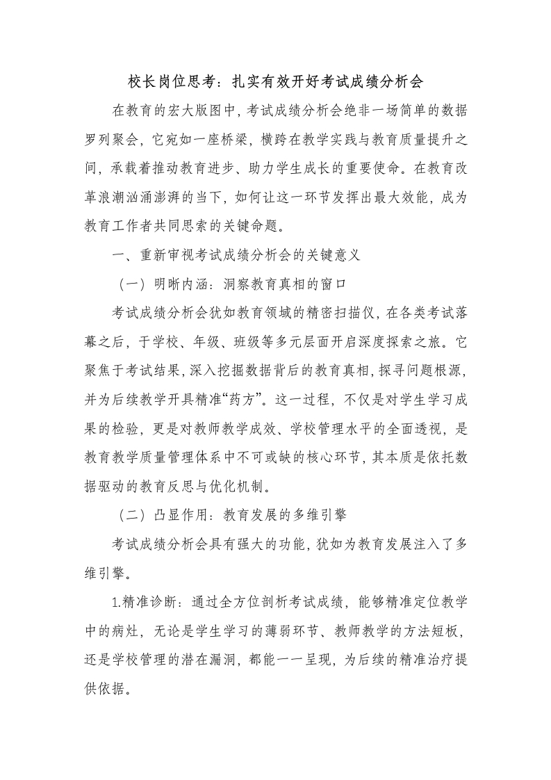 校长岗位思考:扎实有效开好考试成绩分析会在教育的宏大版图中,考试成绩分析会绝非一场简单的数据罗列聚会,它宛如一座桥梁,横跨在教学实践与教育质量提升之间,承载着推动教育进步、助力学生成长的重要使命。在教育改革浪潮汹涌澎湃的当下,如何让这一环节发挥出最大效能,成为教育工作者共同思索的关键命题。一、重新审视考试成绩分析会的关键意义(一))明晰内涵:洞察教育真相的窗口考试成绩分析会犹如教育领域的精密扫描仪,在各类考试落幕之后,于学校、年级、班级等多元层面开启深度探索之旅。它聚焦于考试结果,深入挖掘数据背后的教育真相,探寻问题根源,并为后续教学开具精准“药方”。这一过程,不仅是对学生学习成果的检验,更是对教师教学成效、学校管理水平的全面透视,是教育教学质量管理体系中不可或缺的核心环节,其本质是依托数据驱动的教育反思与优化机制。(二)凸显作用:教育发展的多维引擎考试成绩分析会具有强大的功能,犹如为教育发展注入了多维引擎。1精准诊断:通过全方位剖析考试成绩,能够精准定位教学中的病灶,无论是学生学习的薄弱环节、教师教学的方法短板,还是学校管理的潜在漏洞,都能一一呈现,为后续的精准治疗提供依据。