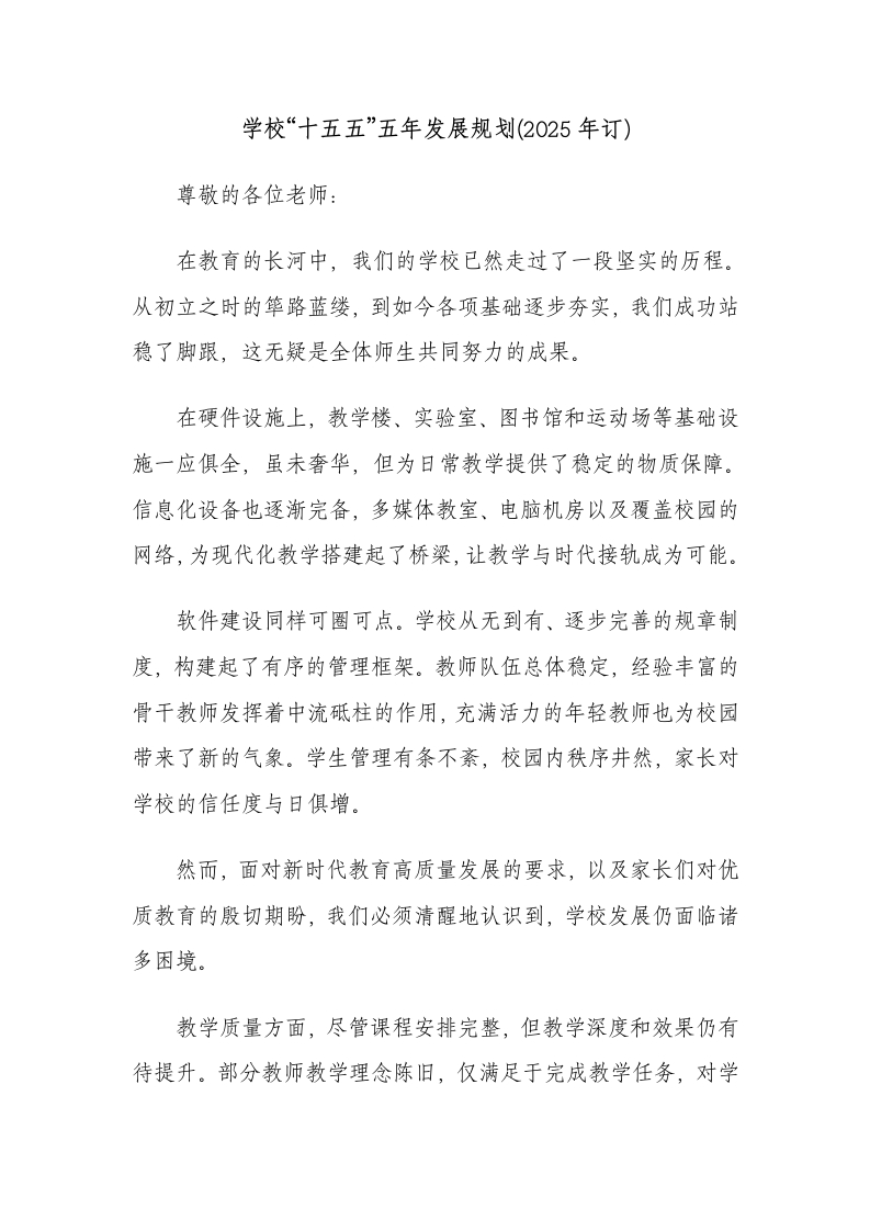 学校“十五五”五年发展规划(2025年订)尊敬的各位老师:在教育的长河中,我们的学校已然走过了一段坚实的历程。从初立之时的筚路蓝缕,到如今各项基础逐步夯实,我们成功站稳了脚跟,这无疑是全体师生共同努力的成果。在硬件设施上,教学楼、实验室、图书馆和运动场等基础设施一应俱全,虽未奢华,但为日常教学提供了稳定的物质保障。信息化设备也逐渐完备,多媒体教室、电脑机房以及覆盖校园的网络,为现代化教学搭建起了桥梁,让教学与时代接轨成为可能。软件建设同样可圈可点。学校从无到有、逐步完善的规章制度,构建起了有序的管理框架。教师队伍总体稳定,经验丰富的骨干教师发挥着中流砥柱的作用,充满活力的年轻教师也为校园带来了新的气象。学生管理有条不紊,校园内秩序井然,家长对学校的信任度与日俱增。然而,面对新时代教育高质量发展的要求,以及家长们对优质教育的殷切期盼,我们必须清醒地认识到,学校发展仍面临诸多困境。教学质量方面,尽管课程安排完整,但教学深度和效果仍有待提升。部分教师教学理念陈旧,仅满足于完成教学任务,对学