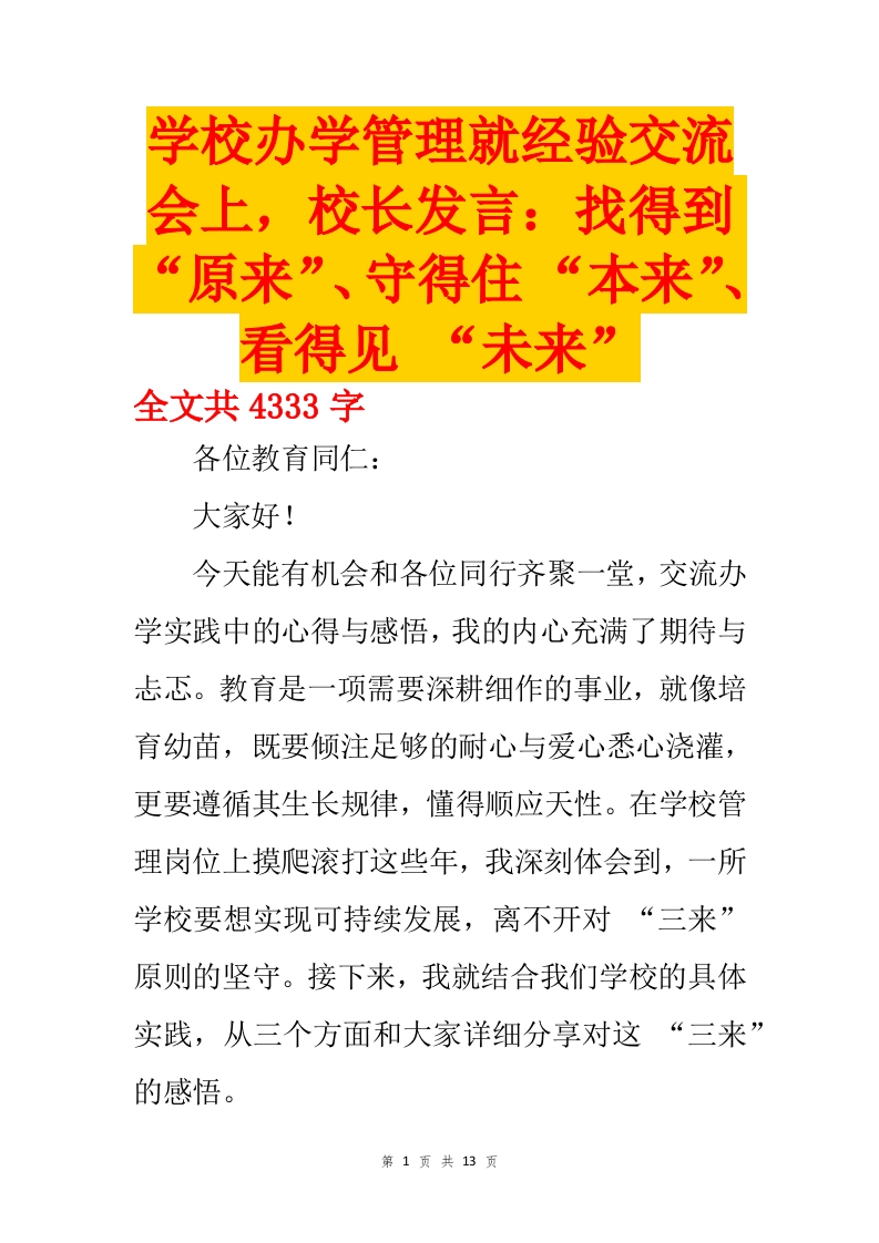 学校办学管理就经验交流会上,校长发言:找得到“原来”、守得住“本来”、看得见“未来”全文共4333字各位教育同仁:大家好!今天能有机会和各位同行齐聚一堂,交流办学实践中的心得与感悟,我的内心充满了期待与忐忑。教育是一项需要深耕细作的事业,就像培育幼苗,既要倾注足够的耐心与爱心悉心浇灌,更要遵循其生长规律,懂得顺应天性。在学校管理岗位上摸爬滚打这些年,我深刻体会到,一所学校要想实现可持续发展,离不开对“三来”原则的坚守。接下来,我就结合我们学校的具体实践,从三个方面和大家详细分享对这“三来”的感悟。第1页共13页