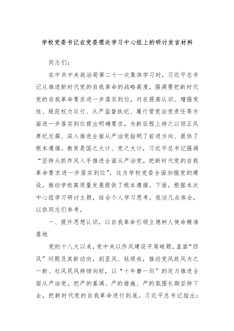学校党委书记在党委理论学习中心组上的研讨发言材料同志们:在中共中央政治局第二十一次集体学习时,习近平总书记从推进新时代党的自我革命的战略高度,强调要把新时代党的自我革命要求进一步落实到位,对在提高认识、增强党性、规范权力运行、从严监督执纪、履行管党治党责任等方面进一步落实到位提出明确要求,为新征程上持之以恒正风肃纪反腐、深入推进全面从严治党指明了前进方向、提供了根本遵循。教育是国之大计、党之大计,习近平总书记强调“坚持从抓作风入手推进全面从严治党,把新时代党的自我革命要求进一步落实到位”,这为学校党委全面加强党的建设,推动学校高质量发展提供了根本遵循。下面,根据本次中心组学习研讨主题,结合个人学习思考,我谈几点体会,以供同志们参考。一、提升思想认识,以自我革命引领立德树人使命精准落地党的十八大以来,党中央以作风建设开局破题,直面“四风”问题及其新动向,刹歪风、祛顽疾,推动党风政风为之一新、社风民风持续向好,以“十年磨一剑”的定力推进全面从严治党,把严的基调、严的措施、严的氛围长期坚持下去,把新时代党的自我革命进行到底。习近平总书记指出: