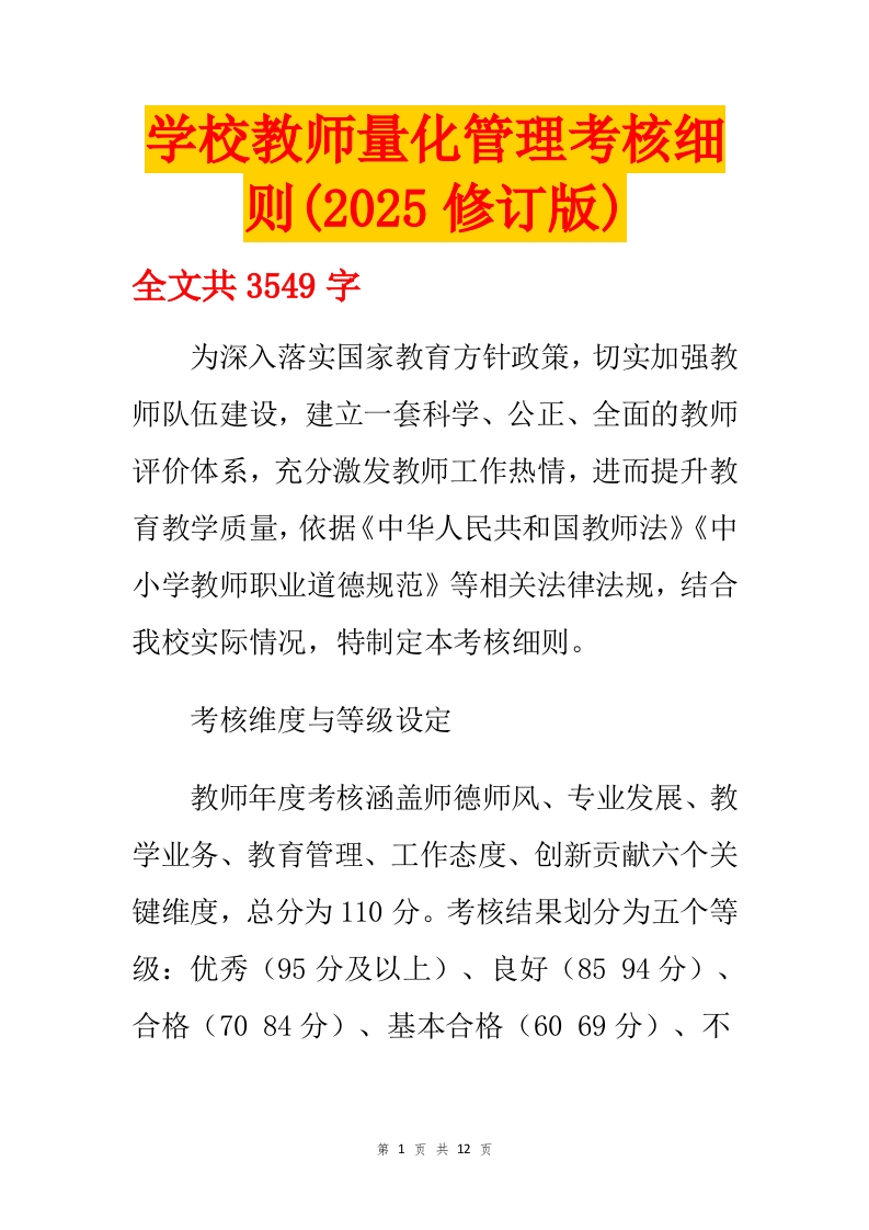 学校教师量化管理考核细则(2025修订版)全文共3549字为深入落实国家教育方针政策,切实加强教师队伍建设,建立一套科学、公正、全面的教师评价体系,充分激发教师工作热情,进而提升教育教学质量,依据《中华人民共和国教师法》《中小学教师职业道德规范》等相关法律法规,结合我校实际情况,特制定本考核细则。考核维度与等级设定教师年度考核涵盖师德师风、专业发展、教学业务、教育管理、工作态度、创新贡献六个关键维度,总分为110分。考核结果划分为五个等级:优秀(95分及以上)、良好(8594分)、合格(7084分)、基本合格(6069分)、不第1页共12页