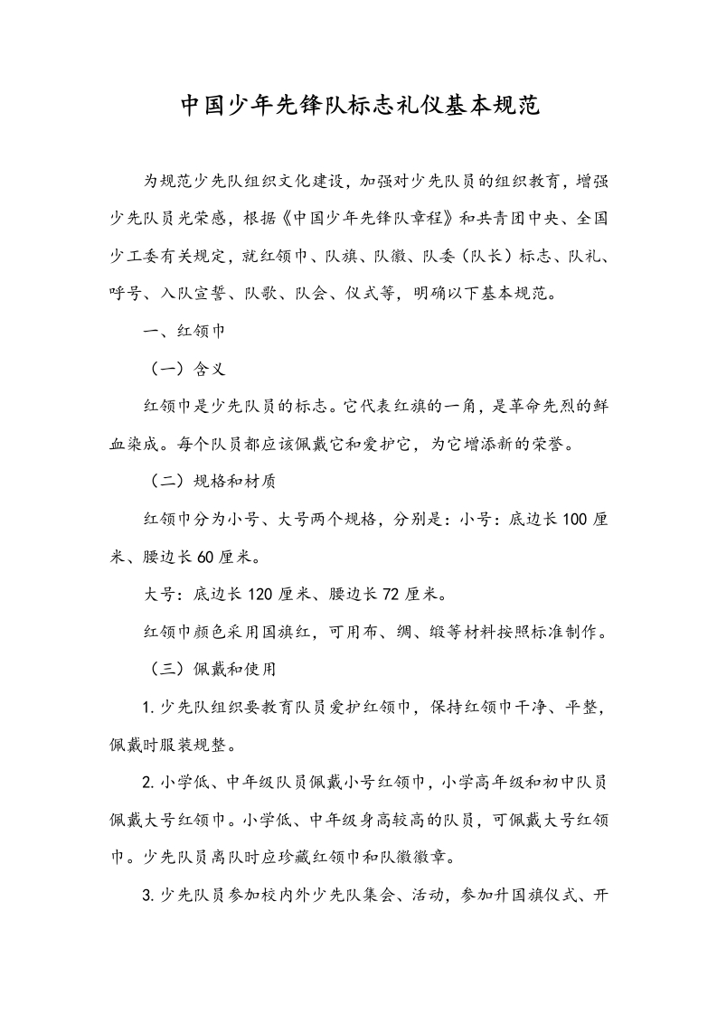 中国少年先锋队标志礼仪基本规范为规范少先队组织文化建设,加强对少先队员的组织教育,增强少先队员光荣感,根据《中国少年先锋队章程》和共青团中央、全国少工委有关规定,就红领巾、队旗、队徽、队委(队长)标志、队礼、呼号、入队宣誓、队歌、队会、仪式等,明确以下基本规范。一、红领巾(一)含义红领巾是少先队员的标志。它代表红旗的一角,是革命先烈的鲜血染成。每个队员都应该佩戴它和爱护它,为它增添新的荣誉。(二)规格和材质红领巾分为小号、大号两个规格,分别是:小号:底边长100厘米、腰边长60厘米。大号:底边长120厘米、腰边长72厘米。红领巾颜色采用国旗红,可用布、绸、缎等材料按照标准制作。(三)佩戴和使用1.少先队组织要教育队员爱护红领巾,保持红领巾干净、平整,佩戴时服装规整。2.小学低、中年级队员佩戴小号红领巾,小学高年级和初中队员佩戴大号红领巾。小学低、中年级身高较高的队员,可佩戴大号红领巾。少先队员离队时应珍藏红领巾和队徽徽章。3.少先队员参加校内外少先队集会、活动,参加升国旗仪式、开