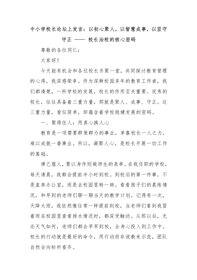中小学校长论坛上发言:以初心聚人,以智慧成事,以坚守守正一一校长治校的核心密码尊敬的各位同仁:大家好!今天能有机会和各位校长齐聚一堂,共同探讨教育管理的心得,我深感荣幸。作为深耕校园多年的教育工作者,我们都清楚,一所学校的发展,校长的作用至关重要。优秀的校长,往往具备着三重力量,那就是聚人、成事、守正。这三重力量,看似简单,却蕴含着学校稳健发展的密码。一、聚得住人:用真心换人心教育是一项需要群策群力的事业,单靠校长一人之力,难以成就一番事业。所以,凝聚人心,是校长开展一切工作的基础。律己服人,要以身作则做师生的表率。在我任职的学校,每天清晨,我都会提前半小时到校。到校后的第一件事,不是直奔办公室,而是去校园里转一转。看看孩子们的晨练情况,和早到的老师们聊一聊当天的教学计划。记得有一次,天降大雨,我依然像往常一样提前到校,当老师们看到我冒着雨在校园里查看排水情况时,都深受触动。从那以后,无论天气如何,老师们都会早早到校,全身心投入到工作中。校长的行动就是最好的命令,用行动而非说教来示范,团队自然会向标杆看齐。