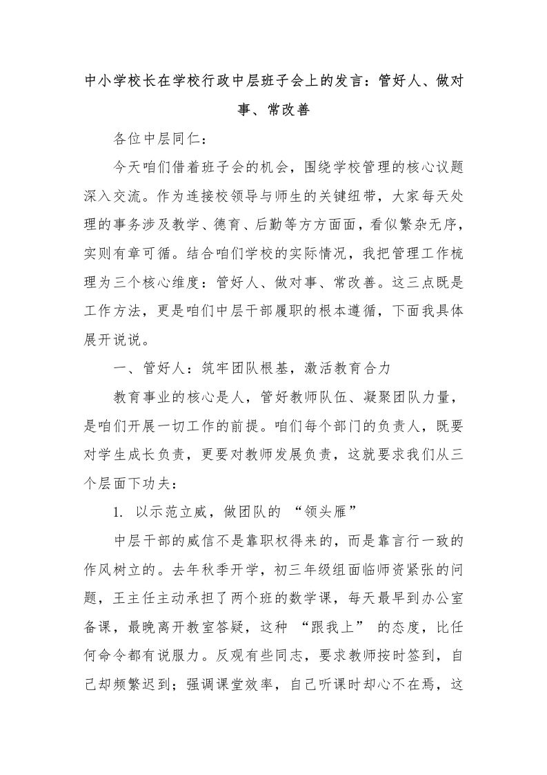 中小学校长在学校行政中层班子会上的发言:管好人、做对事、常改善各位中层同仁:今天咱们借着班子会的机会,围绕学校管理的核心议题深入交流。作为连接校领导与师生的关键纽带,大家每天处理的事务涉及教学、德育、后勤等方方面面,看似繁杂无序,实则有章可循。结合咱们学校的实际情况,我把管理工作梳理为三个核心维度:管好人、做对事、常改善。这三点既是工作方法,更是咱们中层干部履职的根本遵循,下面我具体展开说说。一、管好人:筑牢团队根基,激活教育合力教育事业的核心是人,管好教师队伍、凝聚团队力量,是咱们开展一切工作的前提。咱们每个部门的负责人,既要对学生成长负责,更要对教师发展负责,这就要求我们从三个层面下功夫:1.以示范立威,做团队的“领头雁”中层干部的威信不是靠职权得来的,而是靠言行一致的作风树立的。去年秋季开学,初三年级组面临师资紧张的问题,王主任主动承担了两个班的数学课,每天最早到办公室备课,最晚离开教室答疑,这种“跟我上”的态度,比任何命令都有说服力。反观有些同志,要求教师按时签到,自己却频繁迟到;强调课堂效率,自己听课时却心不在焉,这