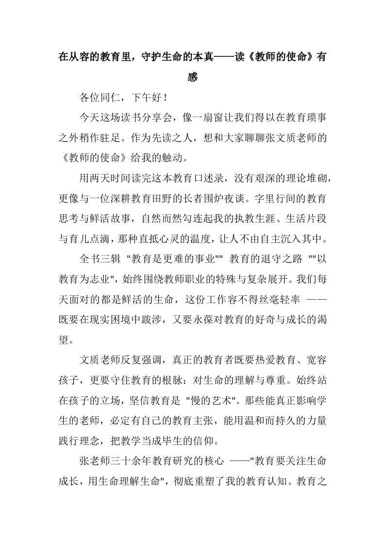 在从容的教育里,守护生命的本真一读《教师的使命》有感各位同仁,下午好!今天这场读书分享会,像一扇窗让我们得以在教育琐事之外稍作驻足。作为先读之人,想和大家聊聊张文质老师的《教师的使命》给我的触动。用两天时间读完这本教育口述录,没有艰深的理论堆砌,更像与一位深耕教育田野的长者围炉夜谈。字里行间的教育思考与鲜活故事,自然而然勾连起我的执教生涯、生活片段与育儿点滴,那种直抵心灵的温度,让人不由自主沉入其中。全书三辑"教育是更难的事业"教育的退守之路"以教育为志业",始终围绕教师职业的特殊与复杂展开。我们每天面对的都是鲜活的生命,这份工作容不得丝毫轻率一一既要在现实困境中跋涉,又要永葆对教育的好奇与成长的渴望。文质老师反复强调,真正的教育者既要热爱教育、宽容孩子,更要守住教育的根脉:对生命的理解与尊重。始终站在孩子的立场,坚信教育是"慢的艺术"。那些能真正影响学生的老师,必定有自己的教育主张,能用温和而持久的力量践行理念,把教学当成毕生的信仰。张老师三十余年教育研究的核心一一"教育要关注生命成长,用生命理解生命",彻底重塑了我的教育认知。教育之