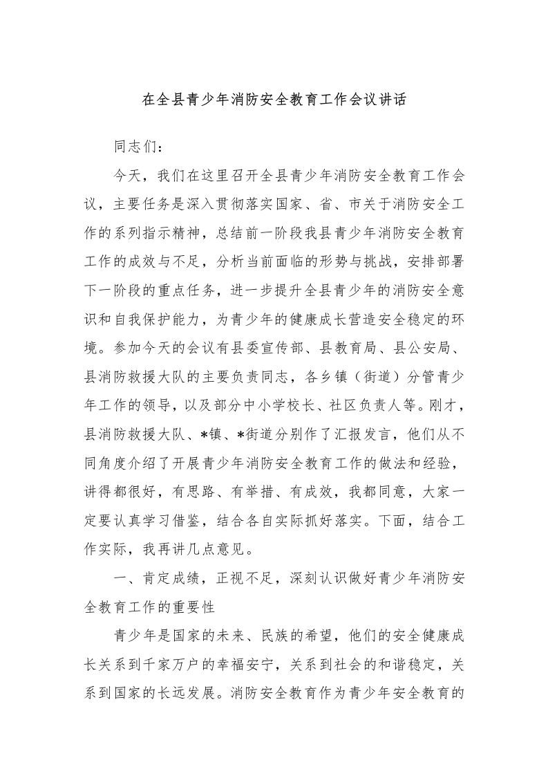 在全县青少年消防安全教育工作会议讲话同志们:今天,我们在这里召开全县青少年消防安全教育工作会议,主要任务是深入贯彻落实国家、省、市关于消防安全工作的系列指示精神,总结前一阶段我县青少年消防安全教育工作的成效与不足,分析当前面临的形势与挑战,安排部署下一阶段的重点任务,进一步提升全县青少年的消防安全意识和自我保护能力,为青少年的健康成长营造安全稳定的环境。参加今天的会议有县委宣传部、县教育局、县公安局、县消防救援大队的主要负责同志,各乡镇(街道)分管青少年工作的领导,以及部分中小学校长、社区负责人等。刚才,县消防救援大队、*镇、*街道分别作了汇报发言,他们从不同角度介绍了开展青少年消防安全教育工作的做法和经验,讲得都很好,有思路、有举措、有成效,我都同意,大家一定要认真学习借鉴,结合各自实际抓好落实。下面,结合工作实际,我再讲几点意见。一、肯定成绩,正视不足,深刻认识做好青少年消防安全教育工作的重要性青少年是国家的未来、民族的希望,他们的安全健康成长关系到千家万户的幸福安宁,关系到社会的和谐稳定,关系到国家的长远发展。消防安全教育作为青少年安全教育的