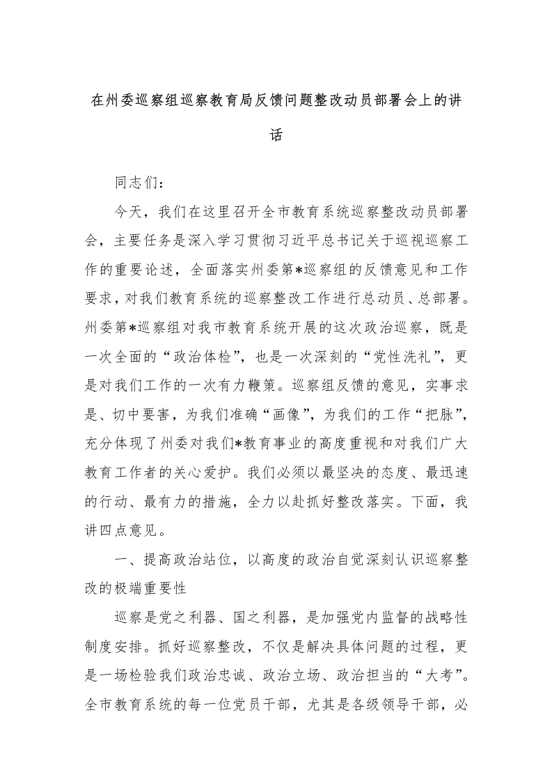 在州委巡察组巡察教育局反馈问题整改动员部署会上的讲话同志们:今天,我们在这里召开全市教育系统巡察整改动员部署会,主要任务是深入学习贯彻习近平总书记关于巡视巡察工作的重要论述,全面落实州委第*巡察组的反馈意见和工作要求,对我们教育系统的巡察整改工作进行总动员、总部署。州委第*巡察组对我市教育系统开展的这次政治巡察,既是一次全面的“政治体检”,也是一次深刻的“党性洗礼”,更是对我们工作的一次有力鞭策。巡察组反馈的意见,实事求是、切中要害,为我们准确“画像”,为我们的工作“把脉”,充分体现了州委对我们*教育事业的高度重视和对我们广大教育工作者的关心爱护。我们必须以最坚决的态度、最迅速的行动、最有力的措施,全力以赴抓好整改落实。下面,我讲四点意见。一、提高政治站位,以高度的政治自觉深刻认识巡察整改的极端重要性巡察是党之利器、国之利器,是加强党内监督的战略性制度安排。抓好巡察整改,不仅是解决具体问题的过程,更是一场检验我们政治忠诚、政治立场、政治担当的“大考”。全市教育系统的每一位党员干部,尤其是各级领导干部,必
