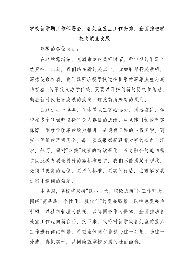 学校新学期工作部署会,各处室重点工作安排:全面推进学校高质量发展!尊敬的各位同仁:在这秋意渐浓、充满希望的美好时节,新学期的乐章已然奏响。此刻,我们站在新的起点上,犹如航船扬起新帆,深感使命在肩。我们既要珍视学校过往积累的深厚底蕴与成功经验,传承优良办学传统,更要以开拓创新的勇气和智慧,顺应新时代教育发展的浪潮,迎接前所未有的挑战。回顾过去一学年,全体教职工齐心协力、拼搏奋进,学校在多个领域都取得了令人瞩目的成绩。从党建引领的坚实保障,到教学改革的稳步推进;从德育实践的丰富多彩,到安全保障的严密周全,每一项成果都凝聚着大家的心血与汗水。然而,面对“双减”政策的持续深化、五育融合的迫切需求以及教育质量提升的高标准要求,我们不能满足于现状,必须以更高的站位、更严的标准、更实的行动,去破解发展过程中遇到的难题。本学期,学校将秉持“以小见大,积微成著”的工作理念,围绕“高品质、个性化、现代化”的发展愿景,以特色发展为引领,以精细管理为依托,以协同合作为保障,全面推动各处室工作迈向新台阶。接下来,我将对新学期各处室的重点工作进行详细部署,希望全体同仁能够心往一处想,劲往一处使,真抓实干,共同绘就学校发展的壮丽画卷。