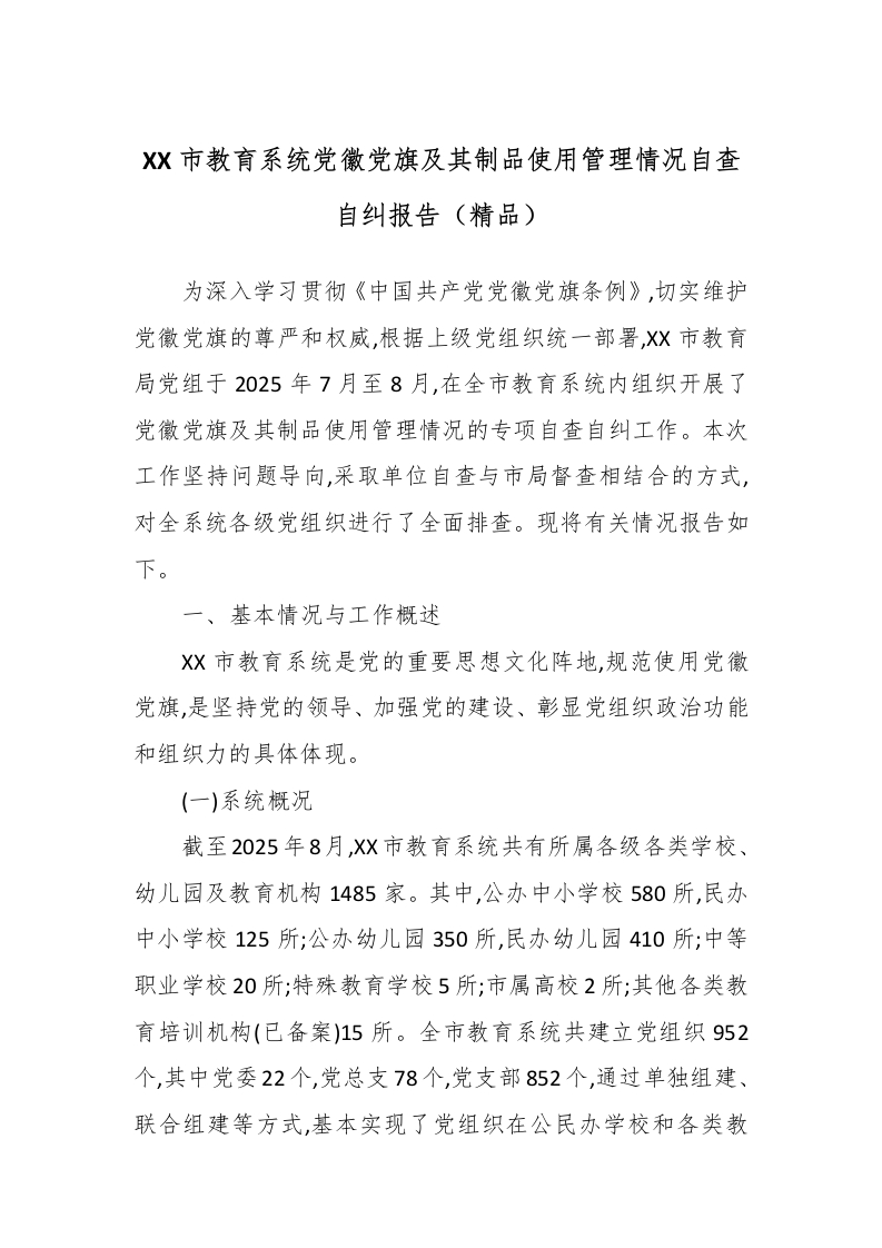 XX市教育系统党徽党旗及其制品使用管理情况自查自纠报告(精品)为深入学习贯彻《中国共产党党徽党旗条例》,切实维护党徽党旗的尊严和权威,根据上级党组织统一部署,X市教育局党组于2025年7月至8月,在全市教育系统内组织开展了党徽党旗及其制品使用管理情况的专项自查自纠工作。本次工作坚持问题导向,采取单位自查与市局督查相结合的方式,对全系统各级党组织进行了全面排查。现将有关情况报告如下。一、基本情况与工作概述X市教育系统是党的重要思想文化阵地,规范使用党徽党旗,是坚持党的领导、加强党的建设、彰显党组织政治功能和组织力的具体体现。(一)系统概况截至2025年8月,XX市教育系统共有所属各级各类学校、幼儿园及教育机构1485家。其中,公办中小学校580所,民办中小学校125所;公办幼儿园350所,民办幼儿园410所;中等职业学校20所;特殊教育学校5所;市属高校2所;其他各类教育培训机构(已备案)15所。全市教育系统共建立党组织952个,其中党委22个,党总支78个,党支部852个,通过单独组建、联合组建等方式,基本实现了党组织在公民办学校和各类教