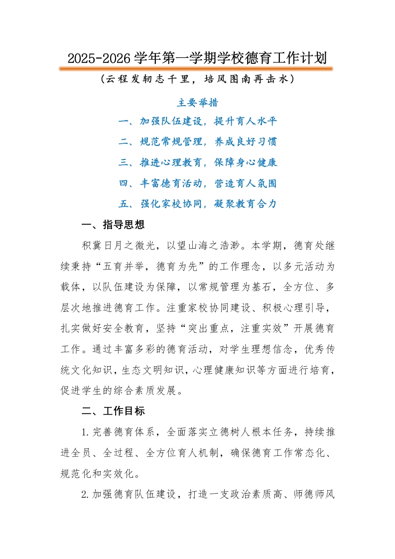 2025-2026秋季学年第一学期德育工作计划:云程发轫志千里,培风图南再击水