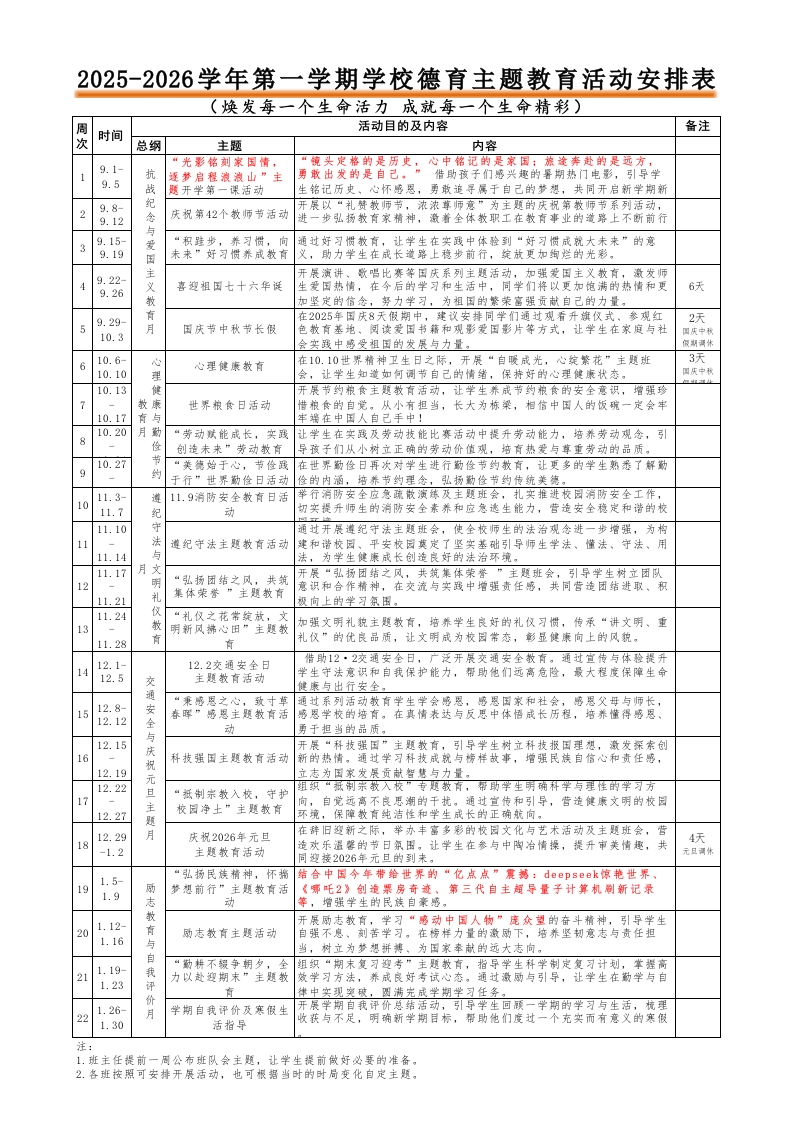 2025-2026学年第一学期学校德育主题教育活动安排表(焕发每一个生命活力成就每一个生命精彩)周活动目的及内容备注时间次总纲主题内容9.1-逐梦启程浪液山”主勇敢出发的是自己·借助孩子们感兴趣的暑期热门电影,引导学9.5题开学第一课活动生铭记历史、心怀感恩,勇敢追寻属于自己的梦想,共同开启新学期新9.8-纪开展以“礼赞教师节,浓浓尊师意”为主题的庆祝第教师节系列活动,9.12念庆祝第42个教师节活动一步弘扬教育家精神,激着全体教职工在教育事业的道路上不断前行9.15爱“积跬步,养习惯,向通过好习惯教有,让学生在实践中体验到“好习惯成就大未来”的意9.19未来”好习惯养成教有义,助力学生在成长道骆上稳步前行,绽放更加绚烂的光彩。9.22开展演讲、歌唱比赛等国庆系列主题活动,加强爱国主义教有,9.26生爱国热情,在今后的学习和生活中,同学门将以更加饱满的热情和更6天加坚定的信念,努力学习,为祖国的繁荣富强贡献自己的力量。9.29-在2025年国庆8天假期中,建议安排同学们通过观看升旗仅式、参观红2天月国庆节中秋节长假色教有基地、阅读爱国书籍和观影爱国影片等方式,让学生在家庭与社10.3会实践中感受祖国的发展与力量。10.6-3天心理健康教有在10.10世界精神卫生日之际,开展“自暖成光,心绽繁花”主题班10.10会让学生知道如何词节自己的情绪,保持好的心理健康状态。10.13开展节约粮食主题教有活动,让学生养成节约粮食的安全意识,增强珍世界粮食日活动惜粮食的自党。从小有担当,长大为栋梁,相信中国人的饭一定会牢10.17牢端在中国人自己手中!10.20月“劳动赋能成长,实践让学生在实践及劳动技能比赛活动中提升劳动能力,培养劳动观念,引创造未来”劳动教有导孩子们从小树立正确的劳动价值观,培育热爱与尊重劳动的品质。10.27在世界勒俭日再次对学生进行勤俭节约教育,让更多的学生熟悉了解勒9约11.3-遵11.9消防安全教有日活举行消防安全应急疏散演练及主题班会,扎实推进校园消防安全工作,1011.7纪动切实提开师生的消防安全素养和应急逃生能力,营造安全稳定和谐的校11.10守通过开展遵纪守法主题班会,使全校师生的法治观念进一步增强,为构11法遵纪守法主题教有活动建和谐校园、平安校园英定了坚实基础引导师生学法、懂法、守法、用11.14与法,为学生健康成长创造良好的法治环境。11.17月文开展“弘扬团结之风,共筑集体荣誉”主题班会,引导学生树立团队12明“弘扬团结之风,共筑集体荣誉”主题教育意识和合作精神,在交流与实践中增强责任感,共同营造团结进取、积11.21礼11.24教明新风拂心田”主题教加强文明礼貌主题教有,培养学生良好的礼仅习惯,传承“讲文明、重1311.28礼仅”的优良品质,让文明成为校园常态,彰显健康向上的风貌,借助12·2交通安全日,广泛开展交通安全教有。通过宣传与体验提升12.1-12.2交通安全日学生守法意识和自我保护能力,帮助他们远高危险,最大程度保障生命12.5交健康与出行安全。通1512.8-“兼感恩之心,致寸草通过系列活动教有学生学会感恩,感恩国家和社会,感恩父母与师长,安春晖”感恩主题教有活感恩学校的培育。在真情表达与反恩中体悟成长历程,培养懂得感恩、12.12全动勇于担当的品质。与12.15庆开展“科技强国”主题教有,引导学生树立科技报国理想,激发深索创16祝科技强国主题教育活动新的热情。通过学习科技成就与榜样故事,增强民族自信心和责任感,12.19元立志为国家发展贡献智慧与力量,12.22“抵制宗教入校,守护17主12.27向自党远离不良恩湖的干扰,通过宣传和引导,营造健康文明的校园境,保障教育纯洁性和学生成长的正确航向。12.29月庆祝2026年元旦在辞旧溲新之际,举办丰富多彩的校园文化与艺术活动及主题班会,营4天18造欢乐温馨的节日氛围。让学生在参与中陶治情操,提升审美情趣,-1.2结合中国今年带给世界的“亿点点”震鹅:deepseek惊艳世界、191.9《哪吒2》创造票房奇迹、第三代自主短导量子计算机刷新记录志动等,增强学生的民族自豪感。教1.12开展励志教有,学习“磨动中国人物”鹿众望的奋斗精神,引导学生20励志教有主题活动自强不息、刘苦学习,在榜样力量的激励下,培养坚韧意志与责任担1.16与当,树立为梦想拼搏、为国家奉献的远大志向。1.19我组织“期末复习迎考”主题教育,指导学生科学制定复习计刺,掌握高效学习方法,养成良好考试心态。通过激励与引导,让学生在勒学与自1.23评律中实现究破,圆满完成学期学习任务。1.26-学期自我评价及寒假生开展学期自我评价总结活动,引导学生回顾一学期的学习与生话,杭理221.30活指导收获与不足,明确新学期目标,帮助他们度过一个充实而有意义的寒假1.班主任提前一周公布班队会主题,让学生提前做好必要的准备。2.各班按照可安排开展活动,也可根据当时的时局变化自定主题。