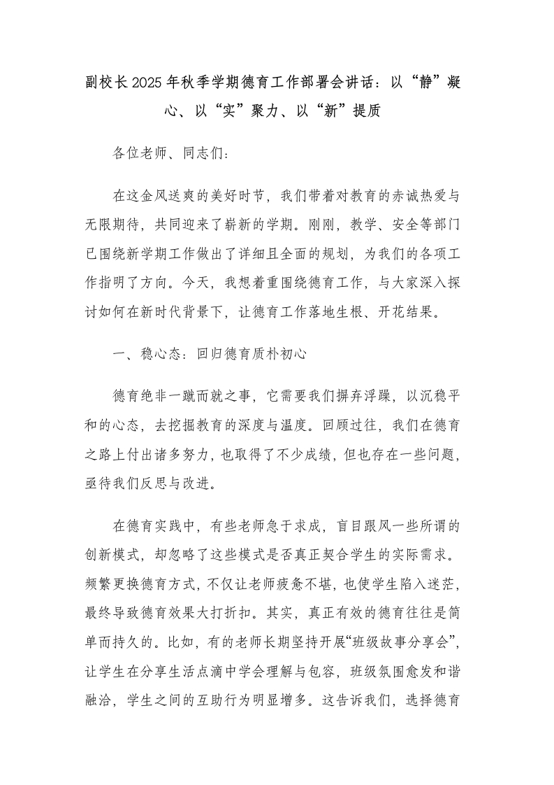 副校长2025年秋季学期德育工作部署会讲话:以“静”凝心、以“实”聚力、以“新”提质各位老师、同志们:在这金风送爽的美好时节,我们带着对教育的赤诚热爱与无限期待,共同迎来了崭新的学期。刚刚,教学、安全等部门已围绕新学期工作做出了详细且全面的规划,为我们的各项工作指明了方向。今天,我想着重围绕德育工作,与大家深入探讨如何在新时代背景下,让德育工作落地生根、开花结果。一、稳心态:回归德育质朴初心德育绝非一蹴而就之事,它需要我们摒弃浮躁,以沉稳平和的心态,去挖掘教育的深度与温度。回顾过往,我们在德育之路上付出诸多努力,也取得了不少成绩,但也存在一些问题,亟待我们反思与改进。在德育实践中,有些老师急于求成,盲目跟风一些所谓的创新模式,却忽略了这些模式是否真正契合学生的实际需求。频繁更换德育方式,不仅让老师疲惫不堪,也使学生陷入迷茫,最终导致德育效果大打折扣。其实,真正有效的德育往往是简单而持久的。比如,有的老师长期坚持开展“班级故事分享会”,让学生在分享生活点滴中学会理解与包容,班级氛围愈发和谐融洽,学生之间的互助行为明显增多。这告诉我们,选择德育