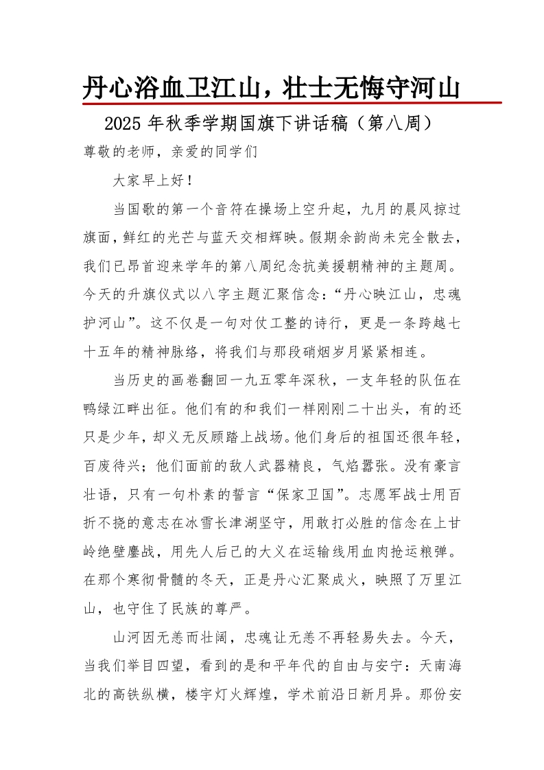 丹心浴血卫江山,壮士无悔守河山2025年秋季学期国旗下讲话稿(第八周)尊敬的老师,亲爱的同学们大家早上好!当国歌的第一个音符在操场上空升起,九月的晨风掠过旗面,鲜红的光芒与蓝天交相辉映。假期余韵尚未完全散去,我们已昂首迎来学年的第八周纪念抗美援朝精神的主题周。今天的升旗仪式以八字主题汇聚信念:“丹心映江山,忠魂护河山”。这不仅是一句对仗工整的诗行,更是一条跨越七十五年的精神脉络,将我们与那段硝烟岁月紧紧相连。当历史的画卷翻回一九五零年深秋,一支年轻的队伍在鸭绿江畔出征。他们有的和我们一样刚刚二十出头,有的还只是少年,却义无反顾踏上战场。他们身后的祖国还很年轻,百废待兴;他们面前的敌人武器精良,气焰嚣张。没有豪言壮语,只有一句朴素的誓言“保家卫国”。志愿军战士用百折不挠的意志在冰雪长津湖坚守,用敢打必胜的信念在上甘岭绝壁鏖战,用先人后己的大义在运输线用血肉抢运粮弹。在那个寒彻骨髓的冬天,正是丹心汇聚成火,映照了万里江山,也守住了民族的尊严。山河因无恙而壮阔,忠魂让无恙不再轻易失去。今天,当我们举目四望,看到的是和平年代的自由与安宁:天南海北的高铁纵横,楼宇灯火辉煌,学术前沿日新月异。那份安