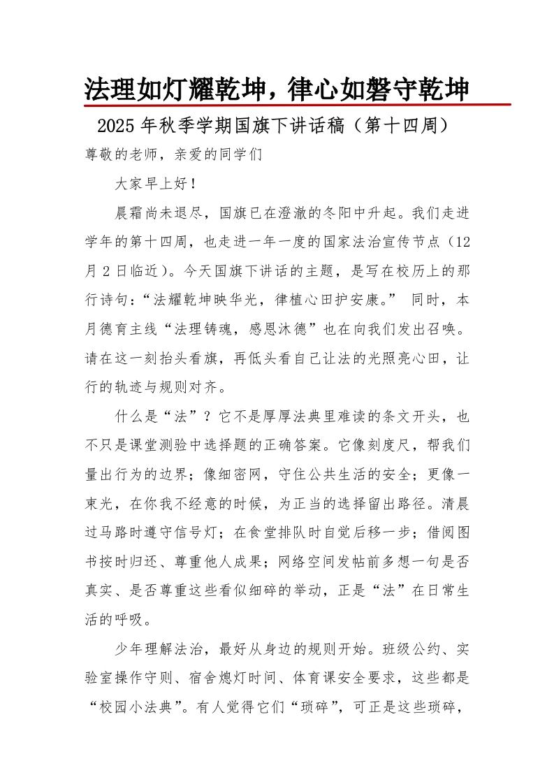 法理如灯耀乾坤,律心如磐守乾坤2025年秋季学期国旗下讲话稿(第十四周)尊敬的老师,亲爱的同学们大家早上好!晨霜尚未退尽,国旗已在澄澈的冬阳中升起。我们走进学年的第十四周,也走进一年一度的国家法治宣传节点(12月2日临近)。今天国旗下讲话的主题,是写在校历上的那行诗句:“法耀乾坤映华光,律植心田护安康。”同时,本月德育主线“法理铸魂,感恩沐德”也在向我们发出召唤。请在这一刻抬头看旗,再低头看自己让法的光照亮心田,让行的轨迹与规则对齐。什么是“法”?它不是厚厚法典里难读的条文开头,也不只是课堂测验中选择题的正确答案。它像刻度尺,帮我们量出行为的边界;像细密网,守住公共生活的安全;更像一束光,在你我不经意的时候,为正当的选择留出路径。清晨过马路时遵守信号灯;在食堂排队时自觉后移一步;借阅图书按时归还、尊重他人成果;网络空间发帖前多想一句是否真实、是否尊重这些看似细碎的举动,正是“法”在日常生活的呼吸。少年理解法治,最好从身边的规则开始。班级公约、实验室操作守则、宿舍熄灯时间、体育课安全要求,这些都是“校园小法典”。有人觉得它们“琐碎”,可正是这些琐碎,