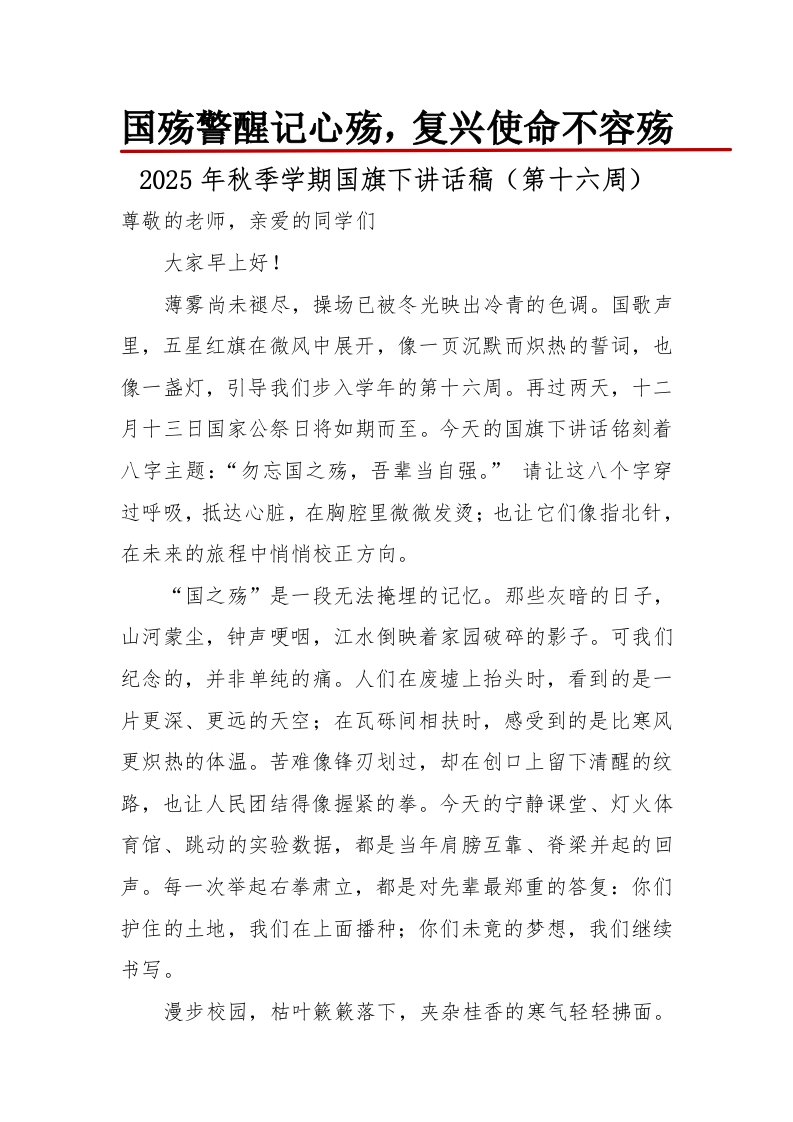 国殇警醒记心殇,复兴使命不容殇2025年秋季学期国旗下讲话稿(第十六周)尊敬的老师,亲爱的同学们大家早上好!薄雾尚未褪尽,操场已被冬光映出冷青的色调。国歌声里,五星红旗在微风中展开,像一页沉默而炽热的誓词,也像一盏灯,引导我们步入学年的第十六周。再过两天,十二月十三日国家公祭日将如期而至。今天的国旗下讲话铭刻着八字主题:“勿忘国之殇,吾辈当自强。”请让这八个字穿过呼吸,抵达心脏,在胸腔里微微发烫;也让它们像指北针,在未来的旅程中悄悄校正方向。“国之殇”是一段无法掩埋的记忆。那些灰暗的日子,山河蒙尘,钟声哽咽,江水倒映着家园破碎的影子。可我们纪念的,并非单纯的痛。人们在废墟上抬头时,看到的是一片更深、更远的天空;在瓦砾间相扶时,感受到的是比寒风更炽热的体温。苦难像锋刃划过,却在创口上留下清醒的纹路,也让人民团结得像握紧的拳。今天的宁静课堂、灯火体育馆、跳动的实验数据,都是当年肩膀互靠、脊梁并起的回声。每一次举起右拳肃立,都是对先辈最郑重的答复:你们护住的土地,我们在上面播种;你们未竟的梦想,我们继续书写。漫步校园,枯叶簌簌落下,夹杂桂香的寒气轻轻拂面。