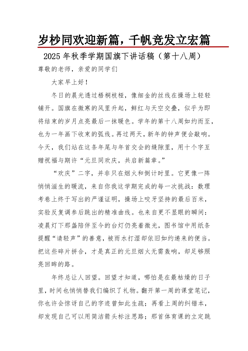 岁抄同欢迎新篇,千帆竞发立宏篇2025年秋季学期国旗下讲话稿(第十八周)尊敬的老师,亲爱的同学们大家早上好!冬日的晨光透过梧桐枝桠,像细金的丝线在操场上轻轻铺开。国旗在微寒的风里升起,鲜红与天空交叠,似乎为即将结束的岁月点亮最后一抹暖色。学年的第十八周如约而至,也为一年画下收束的弧线。再过两天,新年的钟声便会敲响。今天,我们站在这条年尾与年首交会的缝隙里,用十个字互赠祝福与期许“元旦同欢庆,共启新篇章。”“欢庆”二字,并非只在烟火和倒计时里。它更像一阵悄悄滋生的暖流,来自你我这学期完成的每一次挑战:数理考卷上终于写出的严谨证明,操场上咬牙坚持的最后百米,实验反复调参后跳出的精准曲线。也来自更不显眼的瞬间:凌晨灯下那盏陪伴至今的台灯仍亮着微光,图书馆中用纸条提醒“请轻声”的善意,被雨水打湿却依旧如约递来的便当。把这些碎片拼合,才是真正的元旦烟火无需轰响,却足够照亮回眸的路。年终总让人回望。回望才知道,哪怕是在最枯燥的日子里,时间也悄悄替我们编织了礼物。翻开第一周的课堂笔记,你也许会惊讶自己的字迹曾如此生疏;再看上周的纠错本,却发现自己可以用简洁箭头标注思路;那首体育课的立定跳