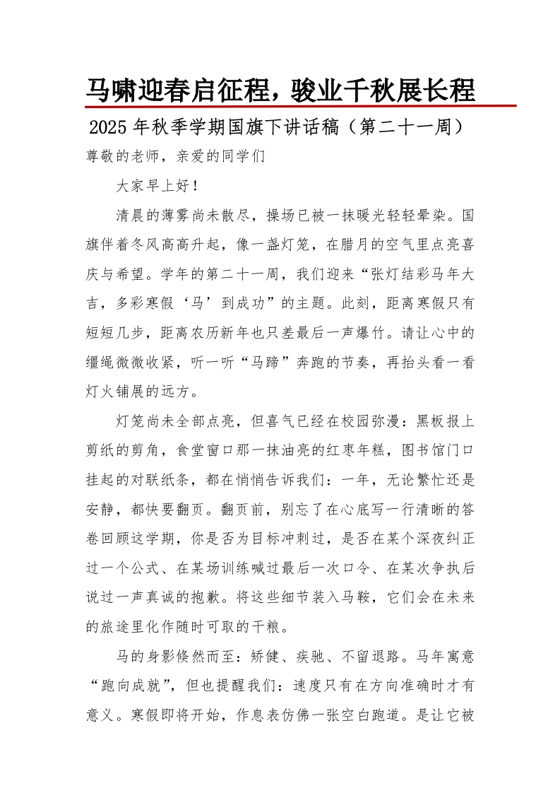 马啸迎春启征程,骏业千秋展长程2025年秋季学期国旗下讲话稿(第二十一周)尊敬的老师,亲爱的同学们大家早上好!清晨的薄雾尚未散尽,操场已被一抹暖光轻轻晕染。国旗伴着冬风高高升起,像一盏灯笼,在腊月的空气里点亮喜庆与希望。学年的第二十一周,我们迎来“张灯结彩马年大吉,多彩寒假‘马’到成功”的主题。此刻,距离寒假只有短短几步,距离农历新年也只差最后一声爆竹。请让心中的缰绳微微收紧,听一听“马蹄”奔跑的节奏,再抬头看一看灯火铺展的远方。灯笼尚未全部点亮,但喜气已经在校园弥漫:黑板报上剪纸的剪角,食堂窗口那一抹油亮的红枣年糕,图书馆门口挂起的对联纸条,都在悄悄告诉我们:一年,无论繁忙还是安静,都快要翻页。翻页前,别忘了在心底写一行清晰的答卷回顾这学期,你是否为目标冲刺过,是否在某个深夜纠正过一个公式、在某场训练喊过最后一次口令、在某次争执后说过一声真诚的抱歉。将这些细节装入马鞍,它们会在未来的旅途里化作随时可取的干粮。马的身影倏然而至:矫健、疾驰、不留退路。马年寓意“跑向成就”,但也提醒我们:速度只有在方向准确时才有意义。寒假即将开始,作息表仿佛一张空白跑道。是让它被