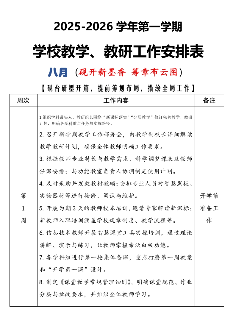 2025-2026学年第一学期学校教学、教研工作安排表八月(砚开新墨香筹章布云图)【砚台研墨开篇,提前筹划布局,描绘全局工作】周次工作内容备注1.组织学科带头人、教研组长围绕“新课标落实”“分层教学”修订完善教学、教研计划,明确各学科重点任务与实施路径。2.召开新学期教学工作部署会,由教学副校长详细解读教学教研计划,确保全体教师明确工作要求。3.根据教师专业特长与教学需求,科学调整课表及教师任课安排:与功能教室负责人协调制定使用计划。4.及时采购并发放教材教辅:安排专业人员对智慧黑板、第实验器材等进行检修、调试与维护。开学前15.开展为期3天的教师校本培训,邀请专家解读新课标;准备工周新教师入职培训涵盖学校规章制度、教学流程等。作6.信息技术教师开展智慧课堂工具实操培训,通过理论讲解、演示与练习,让教师掌握希沃白板功能。7.各学科组进行第一轮集体备课,重点打磨第一周教案和“开学第一课”设计。8.制定《课堂教学常规管理细则》,明确课堂规范、作业分层与批改要求,并组织全体教师学习。