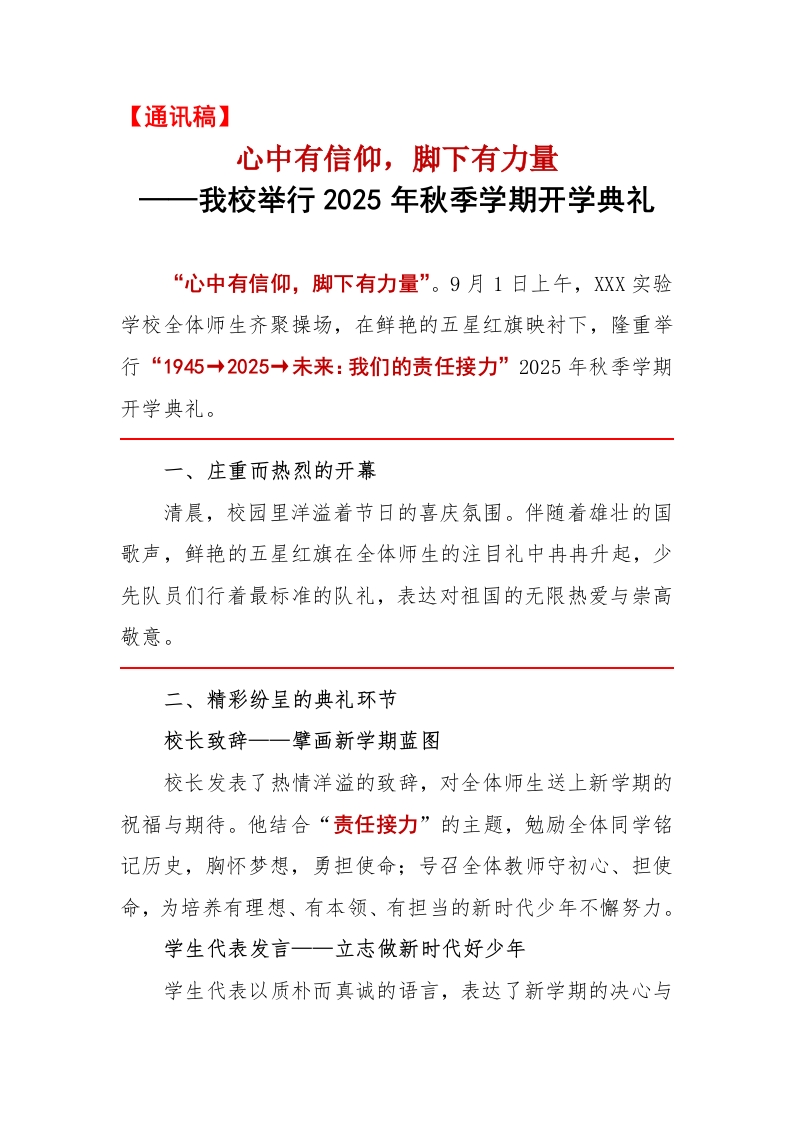 【通讯稿】心中有信仰,脚下有力量我校举行2025年秋季学期开学典礼“心中有信仰,脚下有力量”。9月1日上午,XXX实验学校全体师生齐聚操场,在鲜艳的五星红旗映衬下,隆重举行“1945→2025→未来:我们的责任接力”2025年秋季学期开学典礼。一、庄重而热烈的开幕清晨,校园里洋溢着节日的喜庆氛围。伴随着雄壮的国歌声,鲜艳的五星红旗在全体师生的注目礼中冉冉升起,少先队员们行着最标准的队礼,表达对祖国的无限热爱与崇高敬意。二、精彩纷呈的典礼环节校长致辞一一擘画新学期蓝图校长发表了热情洋溢的致辞,对全体师生送上新学期的祝福与期待。他结合“责任接力”的主题,勉励全体同学铭记历史,胸怀梦想,勇担使命;号召全体教师守初心、担使命,为培养有理想、有本领、有担当的新时代少年不懈努力。学生代表发言一一立志做新时代好少年学生代表以质朴而真诚的语言,表达了新学期的决心与