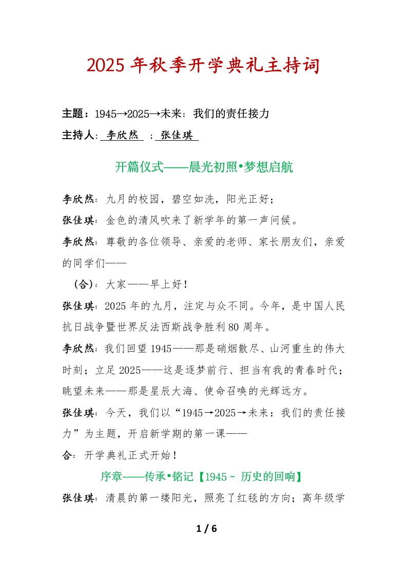 2025年秋季开学典礼主持词主题:1945→2025→未来:我们的责任接力主持人:李欣然;张佳琪开篇仪式一晨光初照•梦想启航李欣然:九月的校园,碧空如洗,阳光正好:张佳琪:金色的清风吹来了新学年的第一声问候。李欣然:尊敬的各位领导、亲爱的老师、家长朋友们,亲爱的同学们一一(合):大家一一早上好!张佳琪:2025年的九月,注定与众不同。今年,是中国人民抗日战争暨世界反法西斯战争胜利80周年。李欣然:我们回望1945一一那是硝烟散尽、山河重生的伟大时刻;立足2025一一这是逐梦前行、担当有我的青春时代:跳望未来一一那是星辰大海、使命召唤的光辉远方。张佳琪:今天,我们以“1945→2025→未来:我们的责任接力”为主题,开启新学期的第一课一合:开学典礼正式开始!序章一传承•铭记【1945-历史的回响】张佳琪:清晨的第一缕阳光,照亮了红毯的方向:高年级学1/6