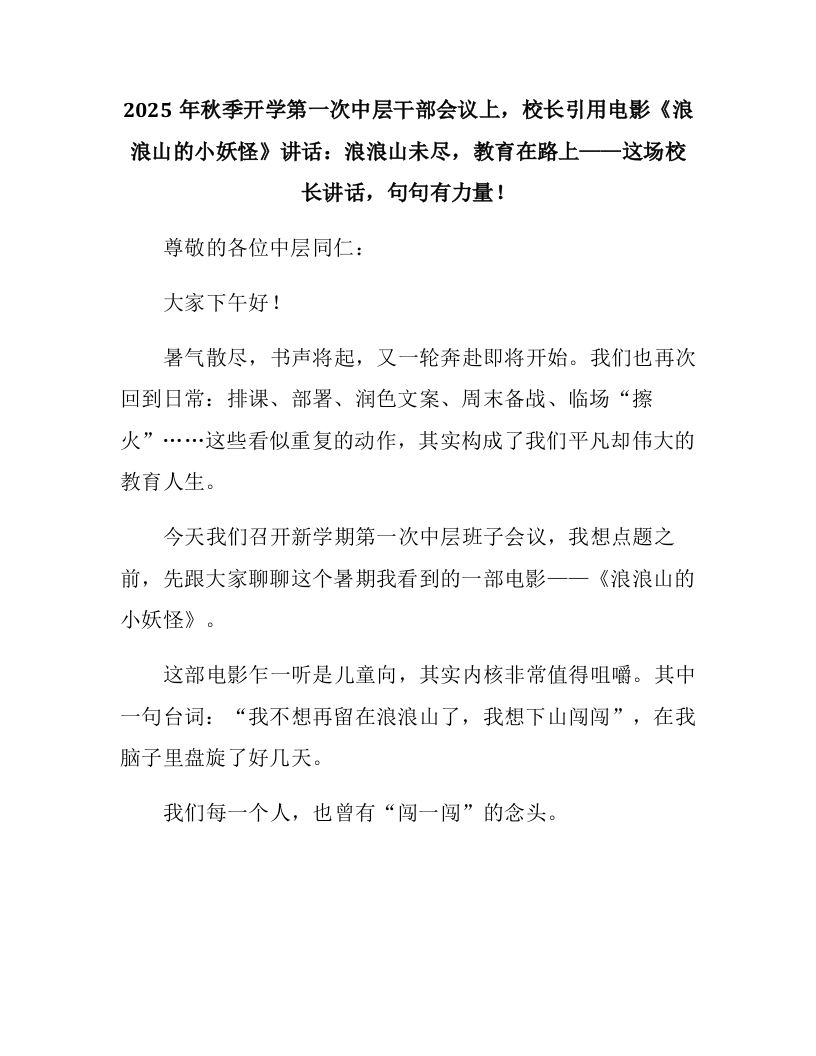 2025年秋季开学第一次中层干部会议上,校长引用电影《浪浪山的小妖怪》讲话:浪浪山未尽,教育在路上一一这场校长讲话,句句有力量!尊敬的各位中层同仁:大家下午好!暑气散尽,书声将起,又一轮奔赴即将开始。我们也再次回到日常:排课、部署、润色文案、周末备战、临场“擦火”…这些看似重复的动作,其实构成了我们平凡却伟大的教育人生。今天我们召开新学期第一次中层班子会议,我想点题之前,先跟大家聊聊这个暑期我看到的一部电影一一《浪浪山的小妖怪》。这部电影乍一听是儿童向,其实内核非常值得咀嚼。其中一句台词:“我不想再留在浪浪山了,我想下山闯闯”,在我脑子里盘旋了好几天。我们每一个人,也曾有“闯一闯”的念头。