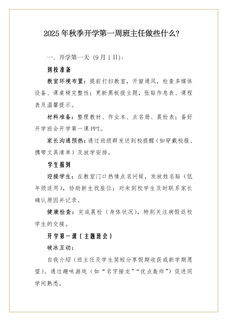 2025年秋季开学第一周班主任做些什么?一、开学第一天(9月1日):到校准备教室环境布置:提前打扫教室,开窗通风,检查多媒体设备、课桌椅完整性;更新黑板报主题,张贴作息表、课程表及温馨提示。材料准备:整理教材、作业本、点名册、晨检表;备好开学班会开学第一课PPT。家长沟通预热:通过班级群发送到校提醒(如穿戴校服、携带文具清单)及放学安排。学生报到迎接学生:在教室门口热情点名问候,发放姓名贴(低年级适用),协助新生找座位;对未到校学生及时联系家长确认原因并记录。健康检查:完成晨检(身体状况),特别关注病假返校学生的交接。开学第一课(主题班会)破冰互动:自我介绍(班主任及学生简短分享假期收获或新学期愿望)。通过趣味游戏(如“名字接龙”“优点轰炸”)促进同学间熟悉。