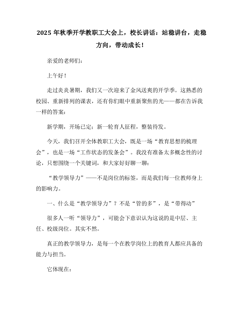 2025年秋季开学教职工大会上,校长讲话:站稳讲台,走稳方向,带动成长!亲爱的老师们:上午好!走过炎炎暑期,我们又一次迎来了金风送爽的开学季。这熟悉的校园、重新排列的课表,还有你们眼中重新聚焦的光一一都在告诉我一样的答案:新学期,开场已定;新一轮育人征程,整装待发。今天,我们召开全体教职工大会,既是一场“教育思想的梳理会”,也是一场“工作状态的发条会”。我没有准备太多概念性的讨论,只想围绕一个关键词,和大家好好聊一聊:“教学领导力”一不是岗位的标签,而是我们每一位教师身上的影响力。一、什么是“教学领导力”?不是“管的多”,是“带得动”很多人一听“领导力”,可能会下意识认为这说的是中层、主任、校级岗位。其实不然。真正的教学领导力,是每一个在教学岗位上的教育人都应具备的能力与担当。它体现在: