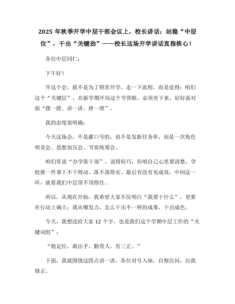 2025年秋季开学中层干部会议上,校长讲话:站稳“中层位”,干出“关键劲”一一校长这场开学讲话直指核心!各位中层同仁:下午好!开这个会,我不是为了照常开学、走一下流程,而是觉得:咱们这个“关键层”,在新学期开局这个节骨眼,必须坐下来,好好面对面“摆一摆、讲一讲、理一理”。我的态度很明确:今天这场会,不是灌口号的,也不是发新任务单,而是一次角色明责会、思想加压会、节奏统筹会。咱们常说“办学靠干部”,说得轻巧,但咱自己心里要清楚,学校推一件事干不干得动、落不落得实、最后有没有见成效,中间这一环,就看我们中层顶不顶得住。所以,从现在开始,我希望大家不仅明白“我要干什么”,更要在行动上确立:我从哪发力,怎么干出不一样的成果,干出成色。今天,我想送给大家12个字,也是我们这个学期中层工作的“关键词组”:“稳定位,敢出手,勤带人,有三正。”下面,我就围绕这四点讲一讲,各位对号入座,自察自问,自我修正。