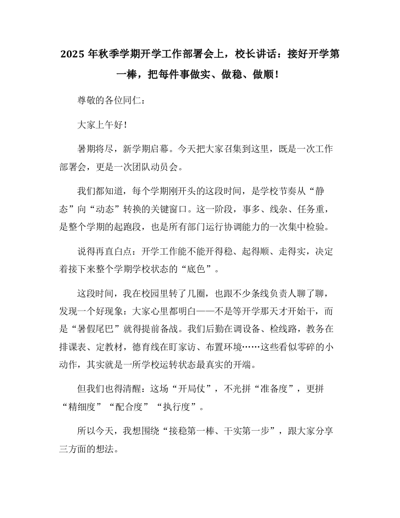 2025年秋季学期开学工作部署会上,校长讲话:接好开学第一棒,把每件事做实、做稳、做顺!尊敬的各位同仁:大家上午好!暑期将尽,新学期启幕。今天把大家召集到这里,既是一次工作部署会,更是一次团队动员会。我们都知道,每个学期刚开头的这段时间,是学校节奏从“静态”向“动态”转换的关键窗口。这一阶段,事多、线杂、任务重,是整个学期的起跑段,也是所有部门运行协调能力的一次集中检验。说得再直白点:开学工作能不能开得稳、起得顺、走得实,决定着接下来整个学期学校状态的“底色”。这段时间,我在校园里转了几圈,也跟不少条线负责人聊了聊,发现一个好现象:大家心里都明白一一不是等开学那天才开始干,而是“暑假尾巴”就得提前备战。我们后勤在调设备、检线路,教务在排课表、定教材,德育线在盯家访、布置环境…这些看似零碎的小动作,其实就是一所学校运转状态最真实的开端。但我们也得清醒:这场“开局仗”,不光拼“准备度”,更拼“精细度”“配合度”“执行度”。所以今天,我想围绕“接稳第一棒、干实第一步”,跟大家分享三方面的想法。