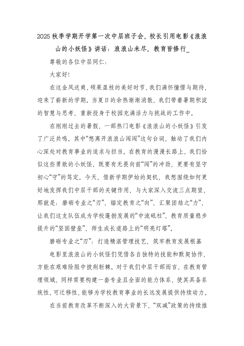 2025秋季学期开学第一次中层班子会,校长引用电影《浪浪山的小妖怪》讲话:浪浪山未尽,教育皆修行尊敬的各位中层同仁:大家好!在这金风送爽、硕果盈枝的美好时节,我们满怀憧憬与期待,迎来了崭新的学期。当夏日的余热渐渐消散,我们带着暑期积淀的智慧与思考,重新投身于校园充满活力与挑战的工作中。在刚刚过去的暑假,一部热门电影《浪浪山的小妖怪》引发了广泛共鸣。其中“想离开浪浪山闯闯”这句台词,触动了我们内心深处对教育事业的追求与担当。在教育的漫漫长路上,我们恰似这些勇敢的小妖怪,既要有无畏向前“闯”的冲劲,更要有坚守初心“守”的笃定。今天,借新学期伊始的契机,我想围绕如何更好地发挥我们中层干部的关键作用,与大家深入交流三点期望,那就是:磨砺专业之“刃”、锚定教育之“向”、汇聚团结之“力”,让我们这支队伍成为学校蓬勃发展的“中流砥柱”、教育质量稳步提升的“坚固壁垒”、师生成长道路上的“明亮灯塔”。磨砺专业之“刃”:打造精湛管理技艺,筑牢教育发展根基电影里浪浪山的小妖怪们凭借各自独特的技能和默契协作,方能在艰难险阻中披荆斩棘。对于我们中层干部而言,在教育管理领域,同样需要构建一套专业且全面的能力体系,使其具备系统性、可迁移性,能够为学校教育事业的长远发展提供持续动力。在当前教育改革不断深入的大背景下,“双减”政策的持续推