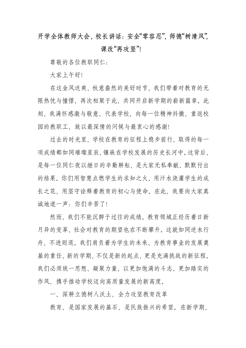 开学全体教师大会,校长讲话:安全“零容忍”,师德“树清风,课改“再攻坚”!尊敬的各位教职同仁:大家上午好!在这金风送爽、秋意盎然的美好时节,我们带着对教育的无限热忱与憧憬,再次相聚于此,共同开启新学期的崭新篇章。此刻,我满怀感激与敬意,代表学校,向每一位精神抖擞、重返校园的教职工,致以最深情的问候与最衷心的感谢!过去的时光里,学校在教育的征程上稳步前行,取得的每一项成绩都如同璀璨星辰,镶嵌在学校发展的历史长河中。这背后,是每一位同仁夜以继日的辛勤耕耘,是大家无私奉献、默默付出的结果。你们用智慧点燃学生的求知之火,用汗水浇灌学生的成长之花,用坚守诠释着教育的初心与使命。在此,我要向大家真诚地道一声:你们辛苦了!然而,我们不能沉醉于过往的成绩。教育领域正经历着日新月异的变革,社会对教育的期望也在不断攀升。这就如同逆水行舟,不进则退。我们肩负着为学生的未来、为教育事业的发展奠基的重任,新的学期,不仅是新的起点,更是充满挑战的新征程。我们必须统一思想、凝聚力量,以更加饱满的斗志、更加踏实的作风,携手推动学校迈向高质量发展的新高度。一、深耕立德树人沃土,全力攻坚教育改革教育,是国家发展的基石,是民族振兴的希望。在新学期,