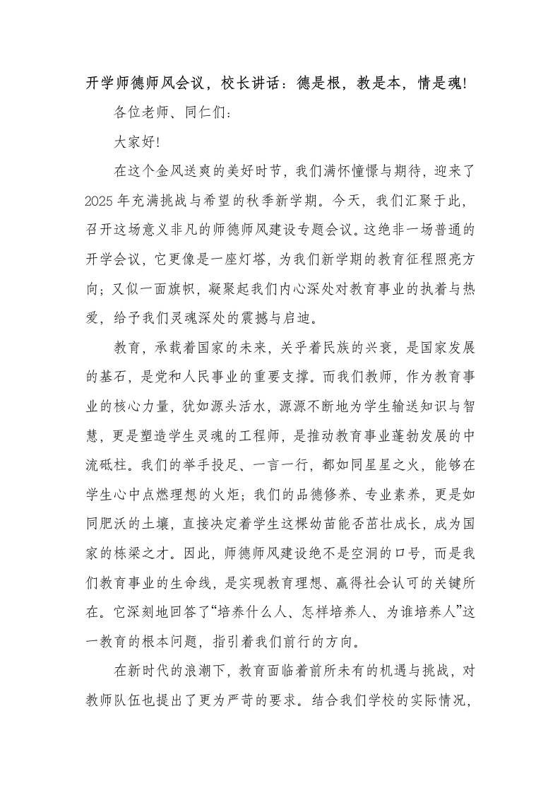 开学师德师风会议,校长讲话:德是根,教是本,情是魂!各位老师、同仁们:大家好!在这个金风送爽的美好时节,我们满怀憧憬与期待,迎来了2025年充满挑战与希望的秋季新学期。今天,我们汇聚于此,召开这场意义非凡的师德师风建设专题会议。这绝非一场普通的开学会议,它更像是一座灯塔,为我们新学期的教育征程照亮方向;又似一面旗帜,凝聚起我们内心深处对教育事业的执着与热爱,给予我们灵魂深处的震撼与启迪。教育,承载着国家的未来,关乎着民族的兴衰,是国家发展的基石,是党和人民事业的重要支撑。而我们教师,作为教育事业的核心力量,犹如源头活水,源源不断地为学生输送知识与智慧,更是塑造学生灵魂的工程师,是推动教育事业蓬勃发展的中流砥柱。我们的举手投足、一言一行,都如同星星之火,能够在学生心中点燃理想的火炬;我们的品德修养、专业素养,更是如同肥沃的土壤,直接决定着学生这棵幼苗能否茁壮成长,成为国家的栋梁之才。因此,师德师风建设绝不是空洞的口号,而是我们教育事业的生命线,是实现教育理想、赢得社会认可的关键所在。它深刻地回答了“培养什么人、怎样培养人、为谁培养人”这一教育的根本问题,指引着我们前行的方向。在新时代的浪潮下,教育面临着前所未有的机遇与挑战,对教师队伍也提出了更为严苛的要求。结合我们学校的实际情况,