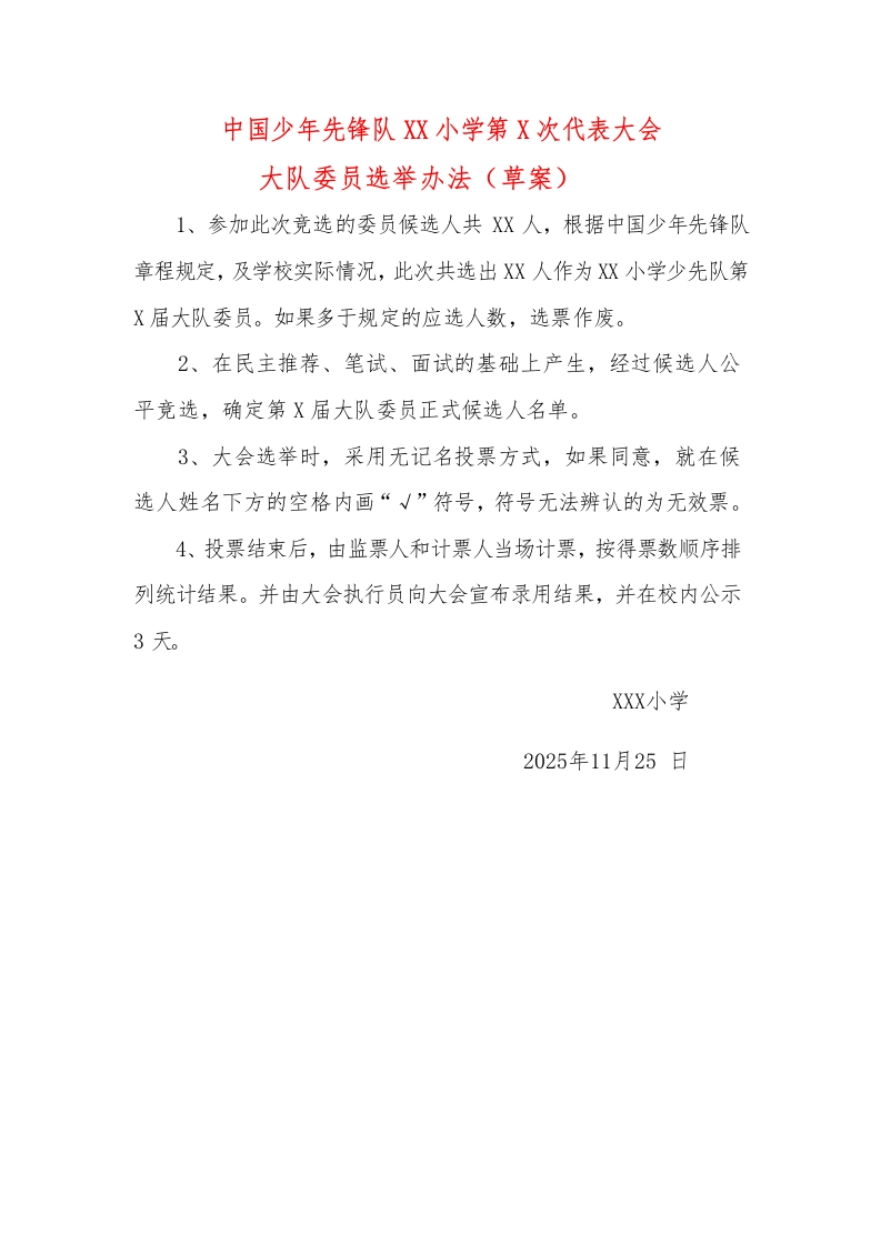 中国少年先锋队Xx小学第X次代表大会大队委员选举办法(草案)1、参加此次竞选的委员候选人共XX人,根据中国少年先锋队章程规定,及学校实际情况,此次共选出XX人作为XX小学少先队第X届大队委员。如果多于规定的应选人数,选票作废。2、在民主推荐、笔试、面试的基础上产生,经过候选人公平竞选,确定第X届大队委员正式候选人名单。3、大会选举时,采用无记名投票方式,如果同意,就在候选人姓名下方的空格内画“√”符号,符号无法辨认的为无效票。4、投票结束后,由监票人和计票人当场计票,按得票数顺序排列统计结果。并由大会执行员向大会宣布录用结果,并在校内公示3天。XXX小学2025年11月25日