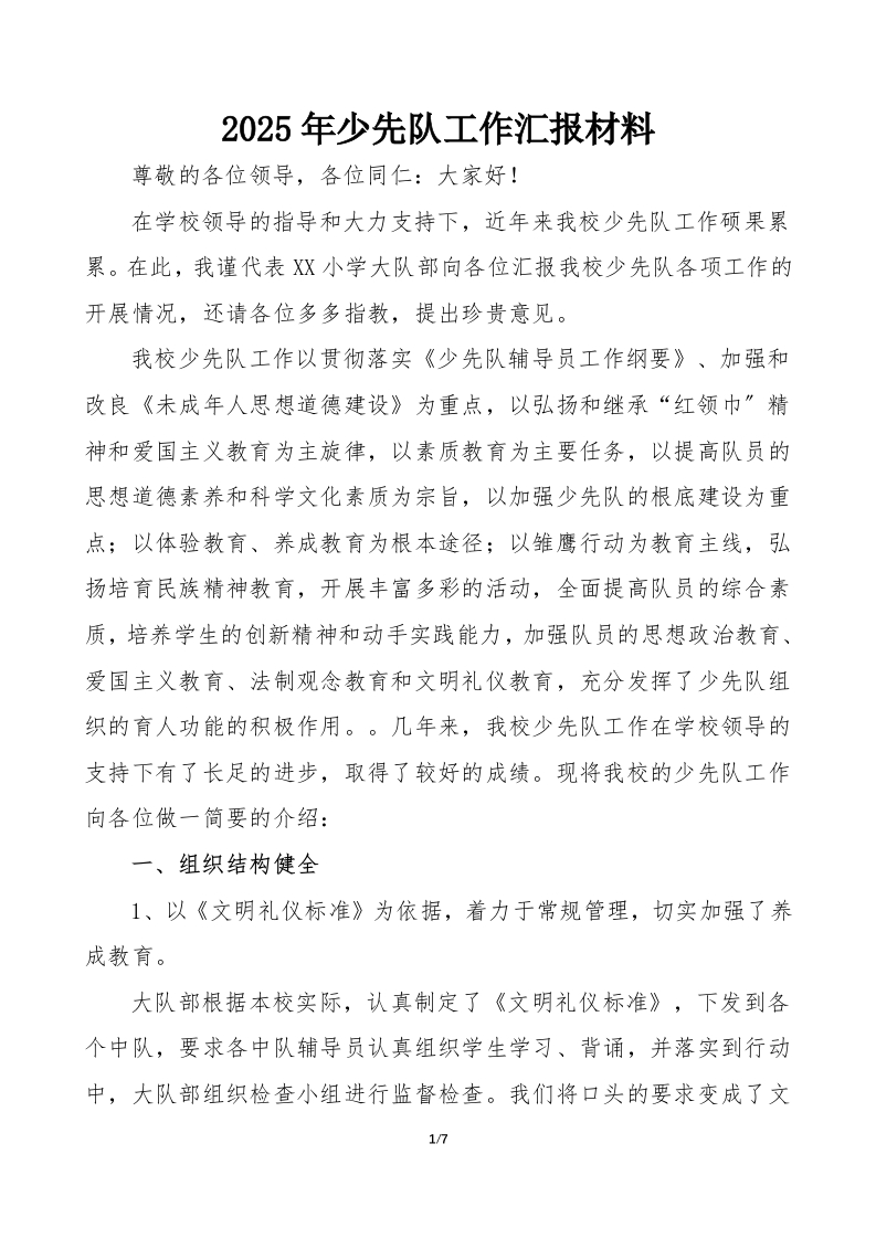 2025年少先队工作汇报材料尊敬的各位领导,各位同仁:大家好!在学校领导的指导和大力支持下,近年来我校少先队工作硕果累累。在此,我谨代表X小学大队部向各位汇报我校少先队各项工作的开展情况,还请各位多多指教,提出珍贵意见。我校少先队工作以贯彻落实《少先队辅导员工作纲要》、加强和改良《未成年人思想道德建设》为重点,以弘扬和继承“红领巾”精神和爱国主义教育为主旋律,以素质教育为主要任务,以提高队员的思想道德素养和科学文化素质为宗旨,以加强少先队的根底建设为重点;以体验教育、养成教育为根本途径;以雏鹰行动为教育主线,弘扬培育民族精神教育,开展丰富多彩的活动,全面提高队员的综合素质,培养学生的创新精神和动手实践能力,加强队员的思想政治教育、爱国主义教育、法制观念教育和文明礼仪教育,充分发挥了少先队组织的育人功能的积极作用。。几年来,我校少先队工作在学校领导的支持下有了长足的进步,取得了较好的成绩。现将我校的少先队工作向各位做一简要的介绍:一、组织结构健全1、以《文明礼仪标准》为依据,着力于常规管理,切实加强了养成教育。大队部根据本校实际,认真制定了《文明礼仪标准》,下发到各个中队,要求各中队辅导员认真组织学生学习、背诵,并落实到行动中,大队部组织检查小组进行监督检查。我们将口头的要求变成了文