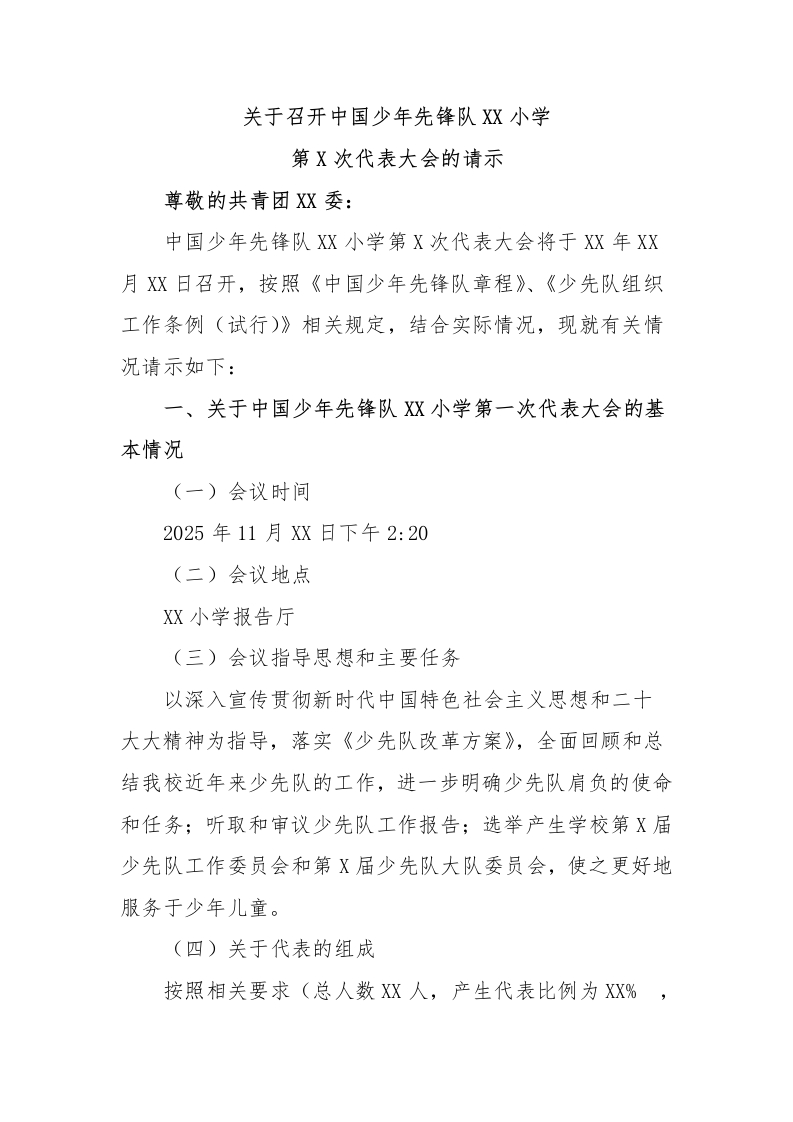 关于召开中国少年先锋队XX小学第X次代表大会的请示尊敬的共青团XX委:中国少年先锋队XX小学第X次代表大会将于X年XX月XX日召开,按照《中国少年先锋队章程》、《少先队组织工作条例(试行)》相关规定,结合实际情况,现就有关情况请示如下:一、关于中国少年先锋队XX小学第一次代表大会的基本情况(一)会议时间2025年11月XX日下午2:20(二)会议地点XX小学报告厅(三)会议指导思想和主要任务以深入宣传贯彻新时代中国特色社会主义思想和二十大大精神为指导,落实《少先队改革方案》,全面回顾和总结我校近年来少先队的工作,进一步明确少先队肩负的使命和任务;听取和审议少先队工作报告;选举产生学校第X届少先队工作委员会和第X届少先队大队委员会,使之更好地服务于少年儿童。(四)关于代表的组成按照相关要求(总人数XX人,产生代表比例为XX%,