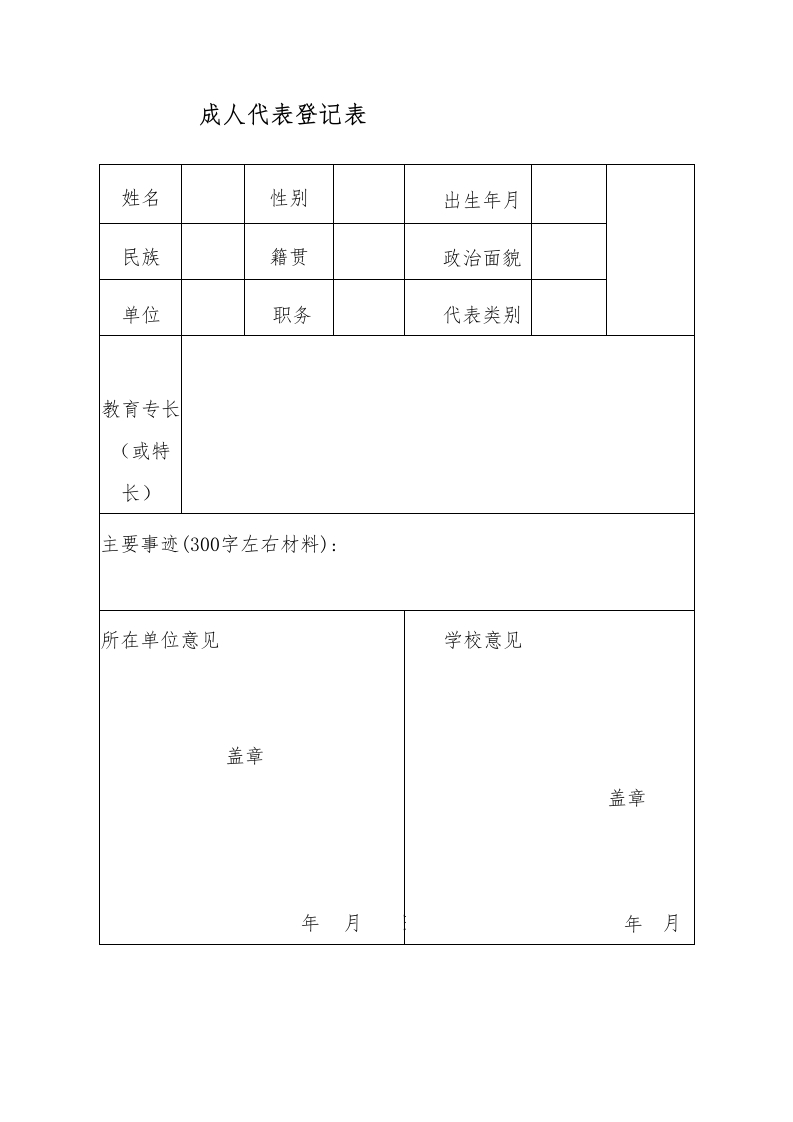 成人代表登记表姓名性别出生年月民族籍贯政治面貌单位职务代表类别教育专长(或特长)主要事迹(300字左右材料):所在单位意见学校意见盖章盖章年月年月