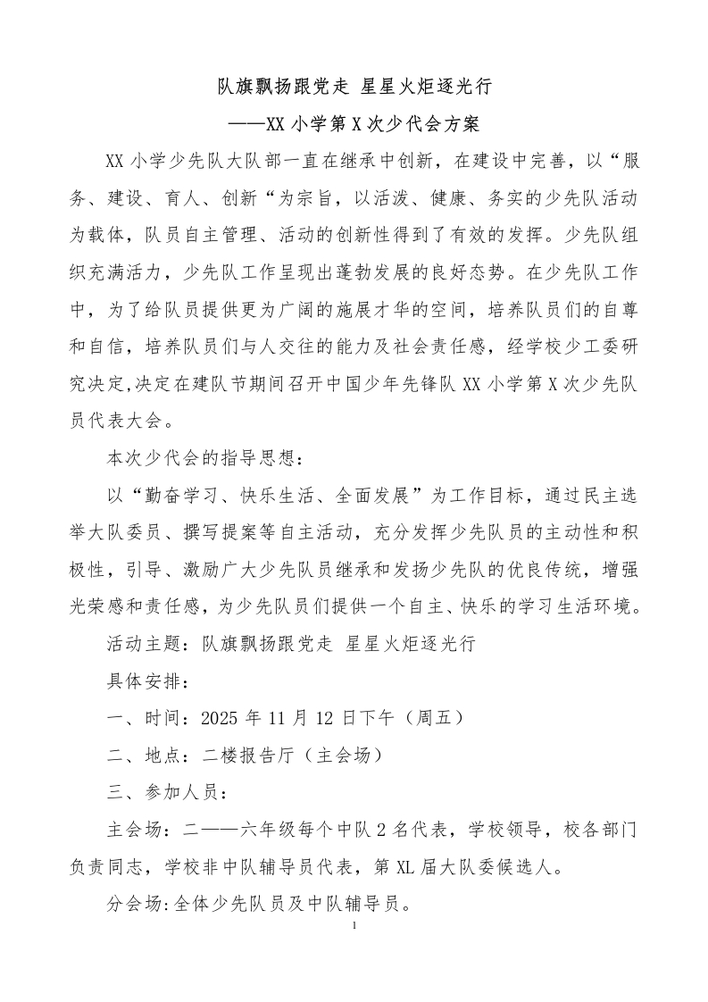 队旗飘扬跟党走星星火炬逐光行一一X小学第X次少代会方案XX小学少先队大队部一直在继承中创新,在建设中完善,以“服务、建设、育人、创新“为宗旨,以活泼、健康、务实的少先队活动为载体,队员自主管理、活动的创新性得到了有效的发挥。少先队组织充满活力,少先队工作呈现出蓬勃发展的良好态势。在少先队工作中,为了给队员提供更为广阔的施展才华的空间,培养队员们的自尊和自信,培养队员们与人交往的能力及社会责任感,经学校少工委研究决定,决定在建队节期间召开中国少年先锋队XX小学第X次少先队员代表大会。本次少代会的指导思想:以“勤奋学习、快乐生活、全面发展”为工作目标,通过民主选举大队委员、撰写提案等自主活动,充分发挥少先队员的主动性和积极性,引导、激励广大少先队员继承和发扬少先队的优良传统,增强光荣感和责任感,为少先队员们提供一个自主、快乐的学习生活环境。活动主题:队旗飘扬跟党走星星火炬逐光行具体安排:一、时间:2025年11月12日下午(周五)二、地点:二楼报告厅(主会场)三、参加人员:主会场:二一一六年级每个中队2名代表,学校领导,校各部门负责同志,学校非中队辅导员代表,第L届大队委候选人。分会场:全体少先队员及中队辅导员。