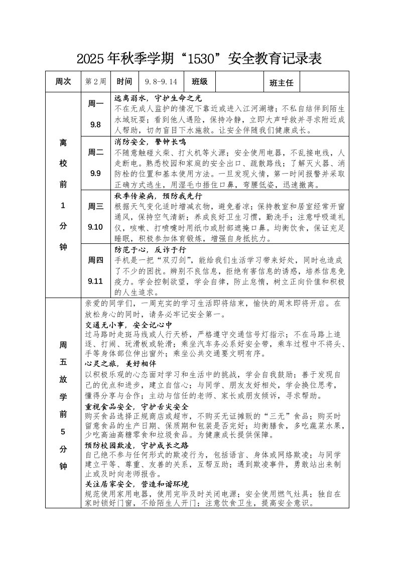 2025年秋季学期“1530”安全教育记录表周次第2周时间9.8-9.14班级班主任周一远离溺水,守护生命之光不在无成人监护的情况下靠近或进入江河湖塘:不私自结伴到陌生9.8水域玩耍:看到他人遇险,保持冷静,立即大声呼救并寻求附近成人帮助,切勿盲目下水施救。让安全伴随我们健康成长。离消防安全,警钟长鸣周二不随意触碰火柴、打火机等火源;安全使用电器,不乱接电线,人校走断电。熟悉校园和家庭的安全出口、疏散路线;了解灭火器、消9.9防栓的位置和基本使用方法。一旦发现火情,第一时间报警并采取前正确方式逃生,用湿毛巾捂住口鼻,弯腰低姿,迅速撤离。秋季传染病,预防我先行周三根据天气变化适时增减衣物,避免着凉;保持教室和居室经常开窗通风,保持空气清新;养成良好卫生习惯,勤洗手;注意呼吸道礼分9.10仪,咳嗽、打喷嚏时用纸巾或肘部遮掩口鼻。均衡饮食,保证充足睡眠,积极参加体育锻炼,增强自身抵抗力。钟防范于心,反诈于行周四手机是一把“双刃剑”,能给我们生活学习带来好处,同时也造成了不少的困扰。辨别不良信息,拒绝有害信息的诱惑,培养信息免9.11疫力。学会控制欲望,学会自律,防止怠惰,树立正向价值和积极的人生追求。亲爱的同学们,一周充实的学习生活即将结束,愉快的周末即将开启。在放松身心的同时,请务必牢记安全第一。交通无小事,安全记心中过马路时走斑马线或人行天桥,严格遵守交通信号灯指示:不在马路上追周逐、打闹、玩滑板或轮滑:乘坐汽车务必系好安全带,乘车过程中不将头、手等身体部位伸出窗外:乘坐公共交通要文明有序。五心灵之旅,美好相伴放以积极乐观的心态面对学习和生活中的挑战,学会自我鼓励:善于发现自己的优点和进步,建立自信心:与同学、朋友友好相处,学会换位思考,学懂得分享与合作:主动与信任的老师、家长或朋友倾诉,寻求帮助。重视食品安全,守护舌尖安全前购买食品选择正规商店或超市,不购买无证摊贩的“三无”食品:购买时留意食品的生产日期、保质期和包装是否完好;均衡膳食,多吃蔬菜水果,少吃高油高糖零食和垃圾食品。为健康成长提供保障。分预防校园欺凌,守护成长之路自己绝不参与任何形式的欺凌行为,包括语言、身体或网络欺凌:与同学钟建立平等、尊重、友善的关系,互帮互助;遇到欺凌事件,勇敢站出来制止或及时向老师报告。关注居家安全,营造和谐环境规范使用家用电器,使用完毕及时关闭电源;安全使用燃气灶具;独自在家时锁好门窗,不给陌生人开门:注意饮食卫生,提高安全意识。