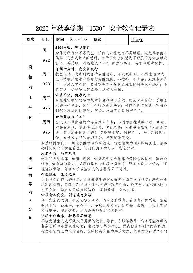 2025年秋季学期“1530”安全教育记录表周次第4周时间9.22-9.28班级班主任周一利剑护蕾,守护花开身体隐私部位不容侵犯,任何人未经允许不得触碰:避免单独前往9.22偏僻、人少或封闭的场所:对于任何让你感到不舒服的身体接触或言语,要勇敢、清晰地说“不”,并立即离开,寻求帮助和保护。离课间十分钟,安全伴我行周二教室内外、走廊通道保持安静有序,不追逐打闹、不做危险游戏:校上下楼梯严格遵守靠右行走的规则,不推挤、不奔跑;未经老师许9.23可,不进入实验室、器材室等专用教室或施工区域等危险场所:不前将刀具、尖锐物品等危险用具带入校园。守法用法,健康成长周三自觉遵守学校的各项规章制度和班级公约,规范自身言行;了解基分9.25本的法律常识,明白什么行为是违法的:当自身权益受到侵害或遇到难以解决的问题时,学会运用法律武器保护自己。钟对防欺凌说“不”周四自己绝不做欺凌的发起者或参与者;与同学交往秉持平等、尊重、友善的原则,学会换位思考,包容差异:如果遭遇欺凌(无论是言9.25语、身体还是网络上的),要明确拒绝,保护自己,并立即向班主任、家长或信任的老师报告,不要沉默忍受。亲爱的同学们,一周充实的学习即将结束,轻松愉快的周末即将到来。请务必时刻将安全放在首位。让我们共同学习以下安全知识。溺水无情,防范先行周绝不私自到水库、池塘、河流、沟渠等无安全保障的危险水域玩耍、游泳或嬉水;如有游泳需求,必须选择有专业救生员值守、配备完善安全设施的正五规游泳场馆,并在家长或监护人的全程陪同下进行。放心理健康,生活之本认识并接纳自己的情绪,学习用健康的方式管理和疏导负面情绪;培养积极学乐观的心态,勇敢面对学习和生活中的困难与挫折,将其视为成长的机会;前珍视友谊,学会与同学真诚沟通、互相理解、合作分享。加强食品安全,创造美好生活5食品安全很关镀。不买无标识食品,远离劣质零食。看清食品保质期,拒绝变质食物。勤洗手,保持卫生。多吃天然食物,如谷物、水果。让我们牢记分食品安全,健康饮食,活力满满地度过校园时光。钟守护生命乐章,拒绝毒品诱惑不接受陌生人或可疑人员提供的饮料、零食、香烟等物品;远离可能涉毒的复杂场所和不健康社交圈;主动学习禁毒知识,提高自身辨别和防范能力。树立积极向上的生活目标,选择健康有益的娱乐方式,坚决对毒品说“不”!