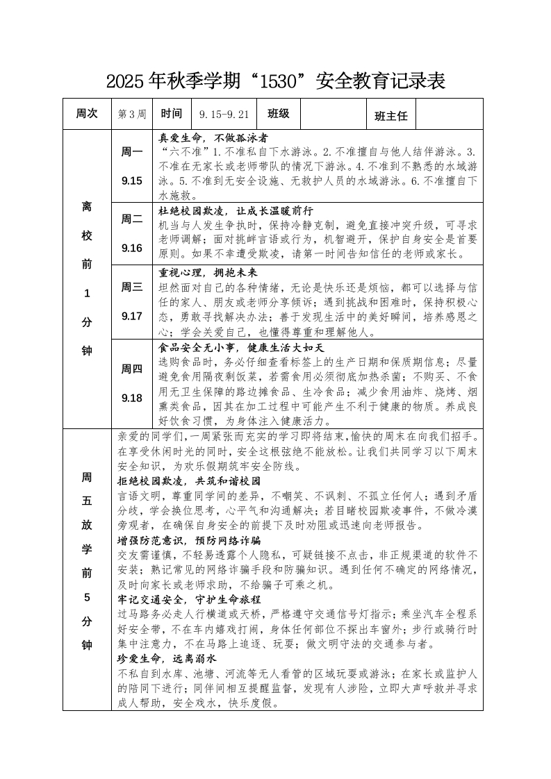 2025年秋季学期“1530”安全教育记录表周次第3周时间9.15-9.21班级班主任真爱生命,不做孤泳者周一“六不准”1.不准私自下水游泳。2.不准擅自与他人结伴游泳。3.不准在无家长或老师带队的情况下游泳。4.不准到不熟悉的水域游9.15泳。5.不准到无安全设施、无救护人员的水域游泳。6.不准擅自下水施救。离杜绝校园欺凌,让成长温暖前行周二机当与人发生争执时,保持冷静克制,避免直接冲突升级,可寻求校老师调解;面对挑衅言语或行为,机智避开,保护自身安全是首要9.16原则。如果不幸遭受欺凌,请第一时间告知信任的老师或家长。前重视心理,拥抱未来周三坦然面对自己的各种情绪,无论是快乐还是烦恼,都可以选择与信任的家人、朋友或老师分享倾诉:遇到挑战和困难时,保持积极心分9.17态,勇敢寻找解决办法:善于发现生活中的美好瞬间,培养感恩之心:学会关爱自己,也懂得尊重和理解他人。钟食品安全无小事,健康生活大如天周四选购食品时,务必仔细查看标签上的生产日期和保质期信息;尽量避免食用隔夜剩饭菜,若需食用必须彻底加热杀菌:不购买、不食9.18用无卫生保障的路边摊食品、生冷食品;减少食用油炸、烧烤、烟熏类食品,因其在加工过程中可能产生不利于健康的物质。养成良好饮食习惯,为身体注入健康活力。亲爱的同学们,一周紧张而充实的学习即将结束,愉快的周末在向我们招手。在享受休闲时光的同时,安全这根弦绝不能放松。让我们共同学习以下周末安全知识,为欢乐假期筑牢安全防线。周拒绝校园欺凌,共筑和谐校园五言语文明,尊重同学间的差异,不嘲笑、不讽刺、不孤立任何人;遇到矛盾分歧,学会换位思考,心平气和沟通解决:若目睹校园欺凌事件,不做冷漠放旁观者,在确保自身安全的前提下及时劝阻或迅速向老师报告。增强防范意识,预防网络诈骗学交友需谨慎,不轻易透露个人隐私,可疑链接不点击,非正规渠道的软件不前安装;熟记常见的网络诈骗手段和防骗知识。遇到任何不确定的网络情况,及时向家长或老师求助,不给骗子可乘之机。牢记交通安全,守护生命旅程分过马路务必走人行横道或天桥,严格遵守交通信号灯指示;乘坐汽车全程系好安全带,不在车内嬉戏打闹,身体任何部位不探出车窗外:步行或骑行时钟集中注意力,不在马路上追逐、玩耍:做文明守法的交通参与者。珍爱生命,远离溺水不私自到水库、池塘、河流等无人看管的区域玩耍或游泳;在家长或监护人的陪同下进行:同伴间相互提醒监督,发现有人涉险,立即大声呼救并寻求成人帮助,安全戏水,快乐度假。